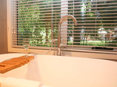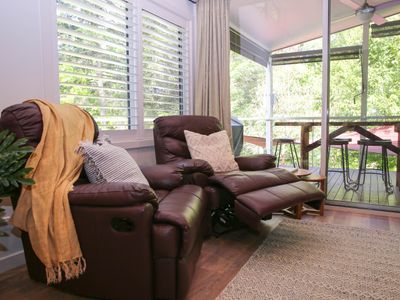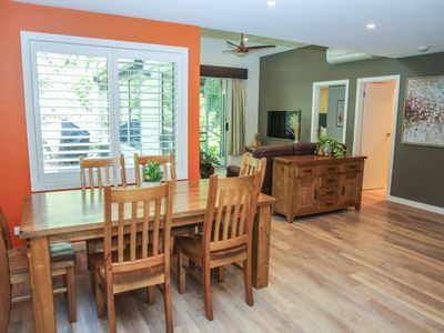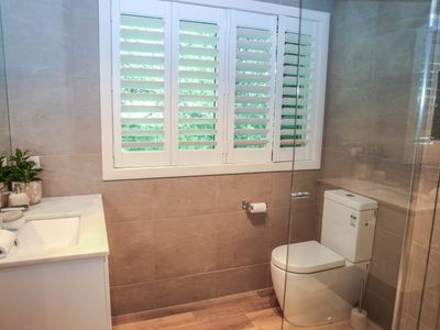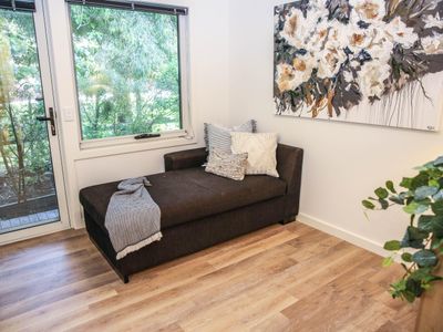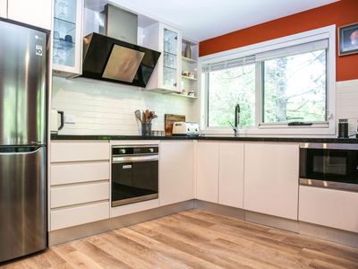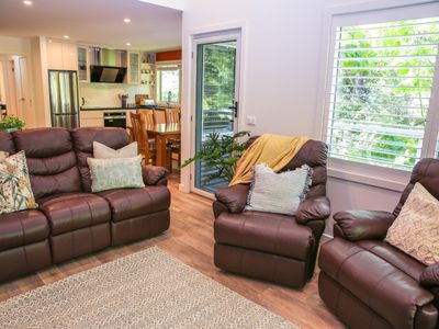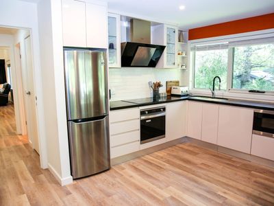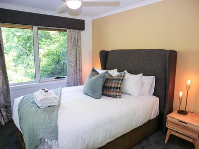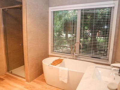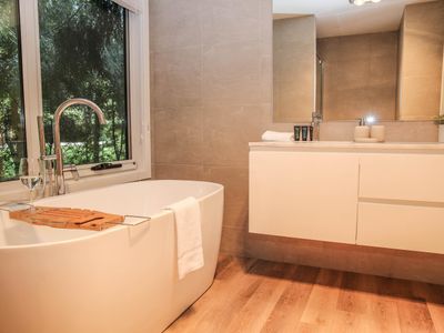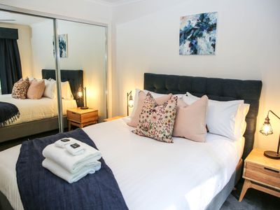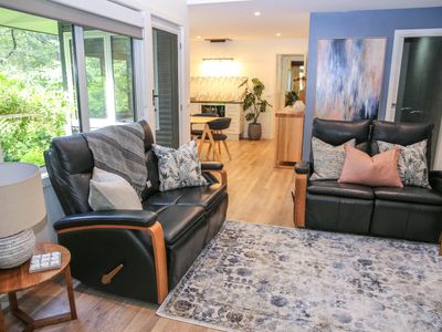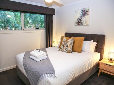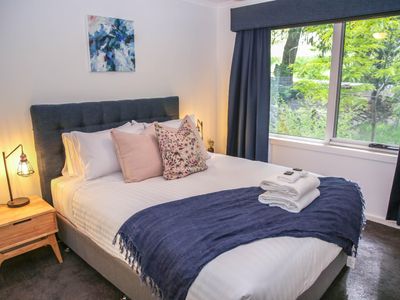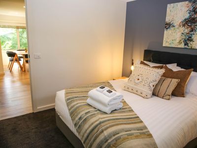 Each bedroom is fitted with a luxurious queen bed and ample wardrobe space to really settle in for those longer stays. No bedrooms have an ensuite which allows all guests to access any of the 3 spacious, modern bathrooms. Enjoy a quick rain shower or steep in the deep free-standing bath to rejuvenate after a hard day's fun, read a book or simply gaze out the large window directly into the private outdoor garden, the choice is yours.