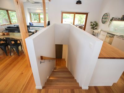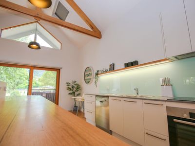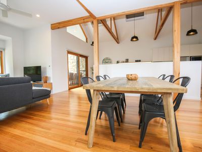 Relax in the sunny open plan living area with gorgeous views of the surrounding mountains and sun streaming through perfectly positioned windows and skylights. The vaulted ceilings with stunning exposed beams create a spacious zone to unwind & reconnect. The gorgeous window seat is the perfect place to leave it all behind.
