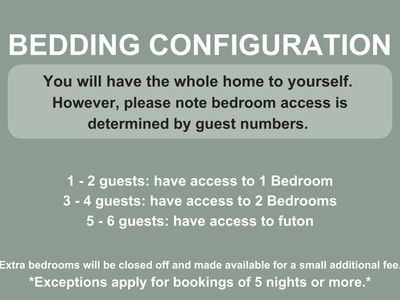 • Extra bedrooms will be closed off and can only be made available for a a small additional fee. * 1-2 guests offers 1 bedroom, 3-4 guests offers 2 bedrooms, 5-6 guests offers use of futon. Exceptions apply for bookings of 5 nights or more.