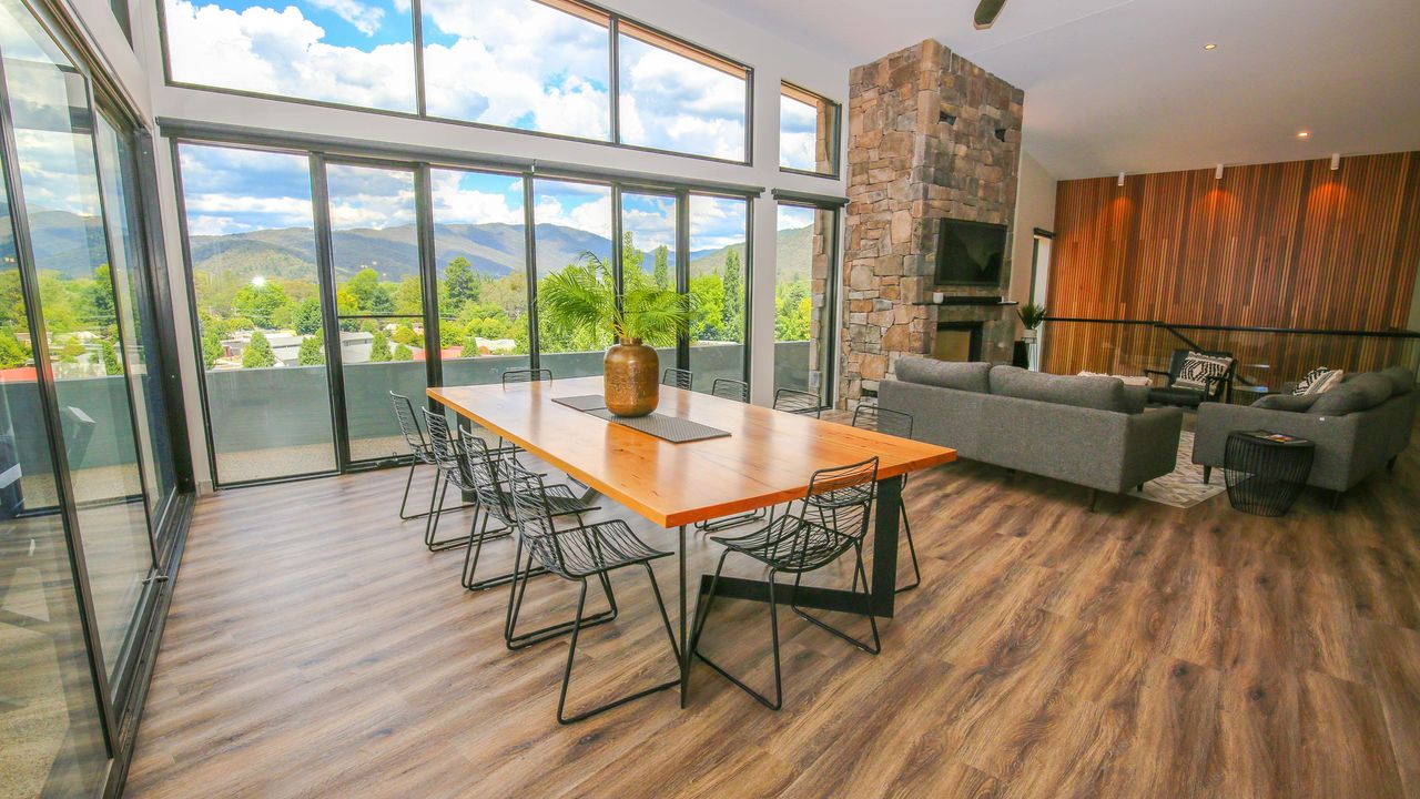 A truly new class for modern luxury escapes in Bright. This private, luxury retreat perched high above the town showcases breathtaking panoramic views of the surrounding region. Spacious and serene, the glorious views from the floor to ceiling windows will simply take your breath away. Edging on to the Alpine State Forest, this property is within walking distance to the Bright town centre so you can have the best of both worlds. Featuring open fires and state of the art fixtures throughout, a stay at Kangaroo Lodge will ensure you truly relax and unwind, yet allow you to immerse yourself in all the town has to offer when you feel like venturing out. Did we mention the climate controlled pool spa? Overlooking the surrounding mountains of Bright, this is a little piece of heaven in the high country!