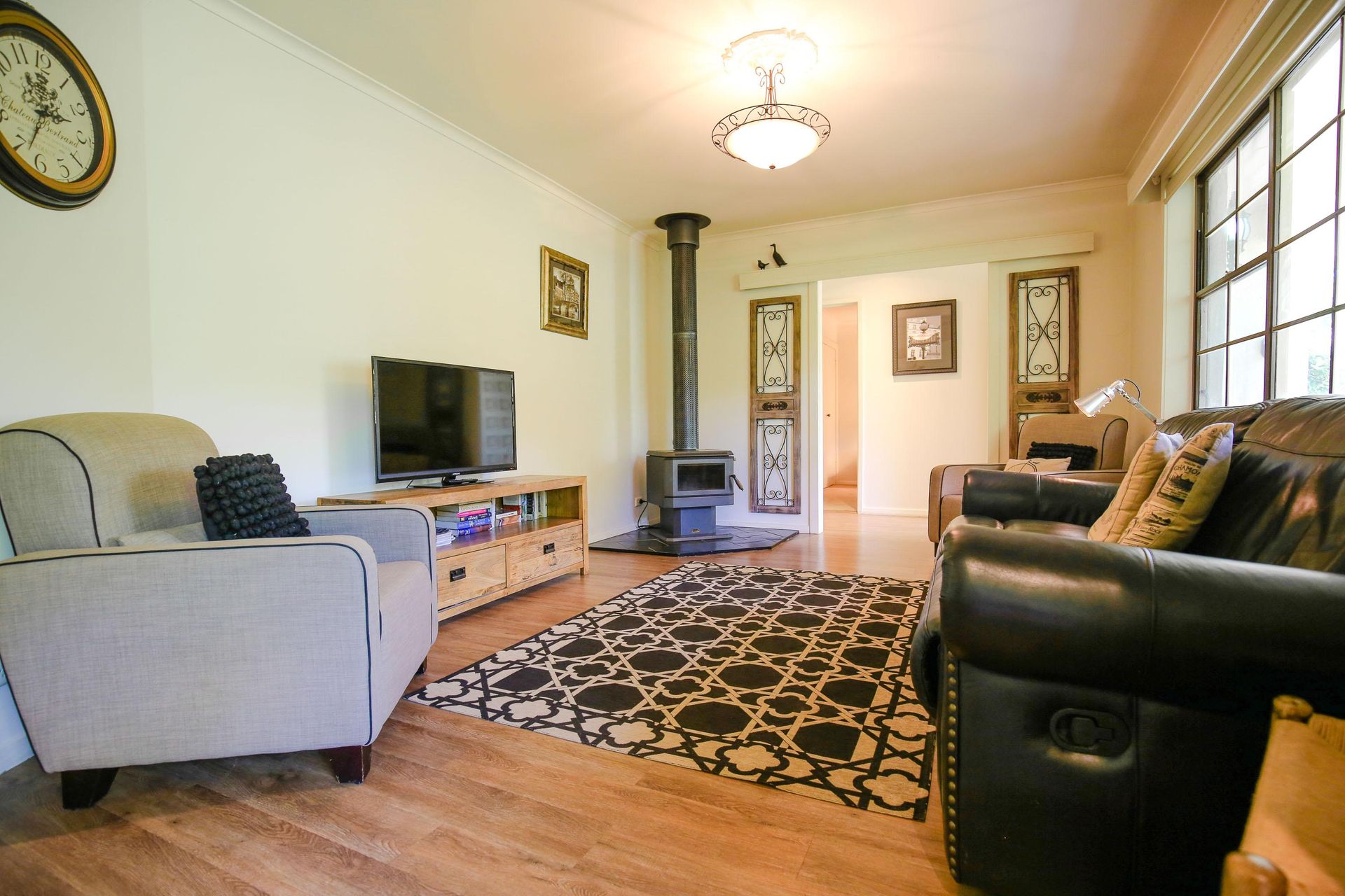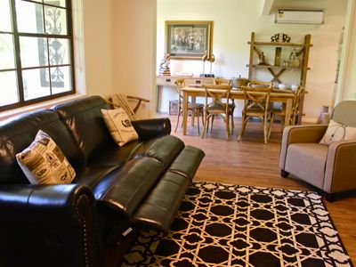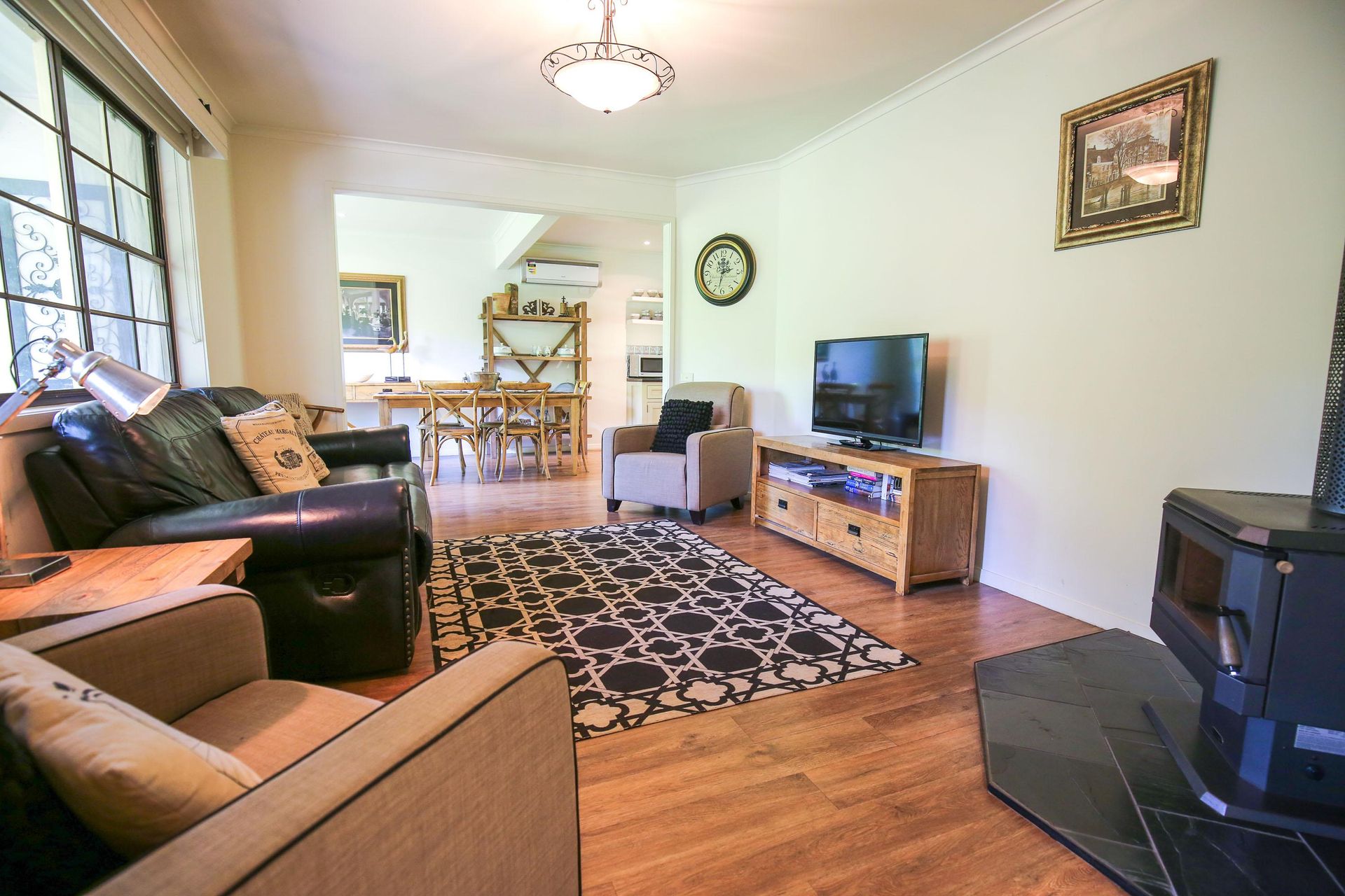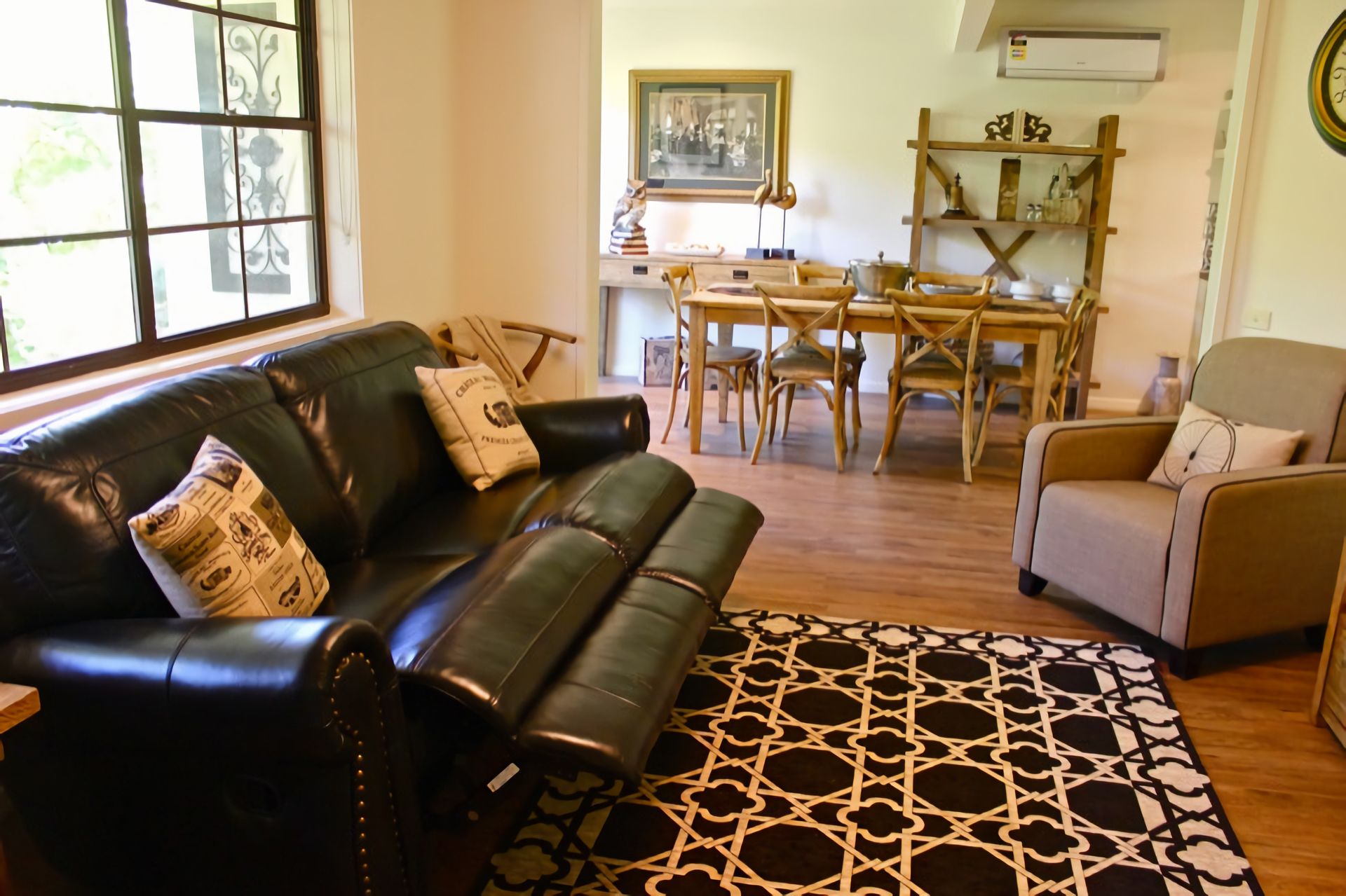 Open & Sunny Living: The living area is bathed in natural light, featuring a Smart TV and luxurious reclining leather lounges. Whether you're cozying up by the wood fire in winter or enjoying cool comfort in summer, Abbeville ensures a delightful stay.