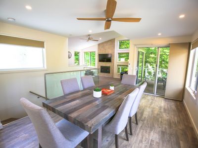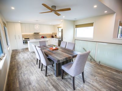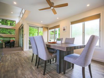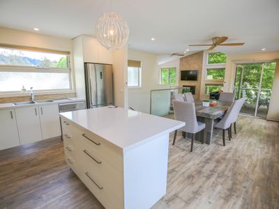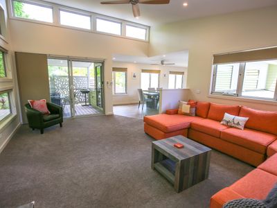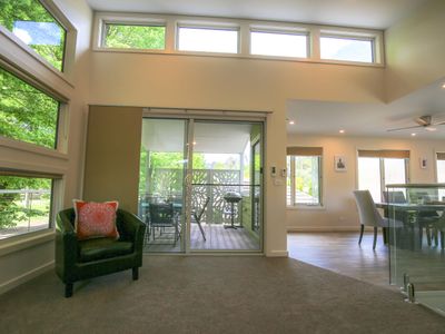 Relax in the beautiful open plan living space - in the green season feel like you are in a luxurious treehouse embraced by the gorgeous tree out your window, in the cooler months, let the sun stream in and enjoy the views to the Rail Trail.