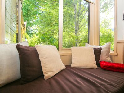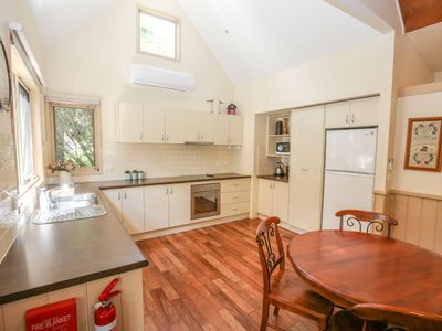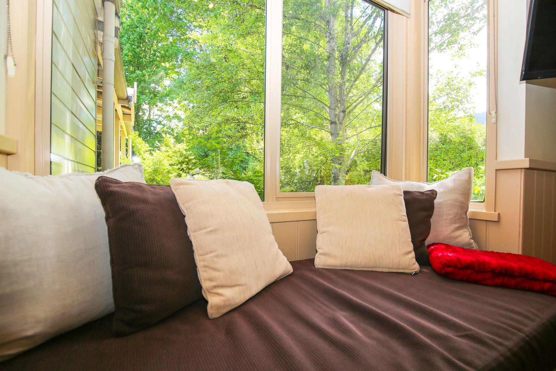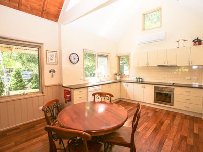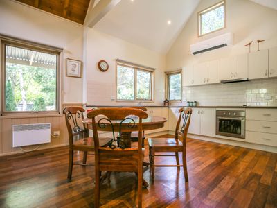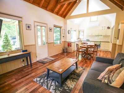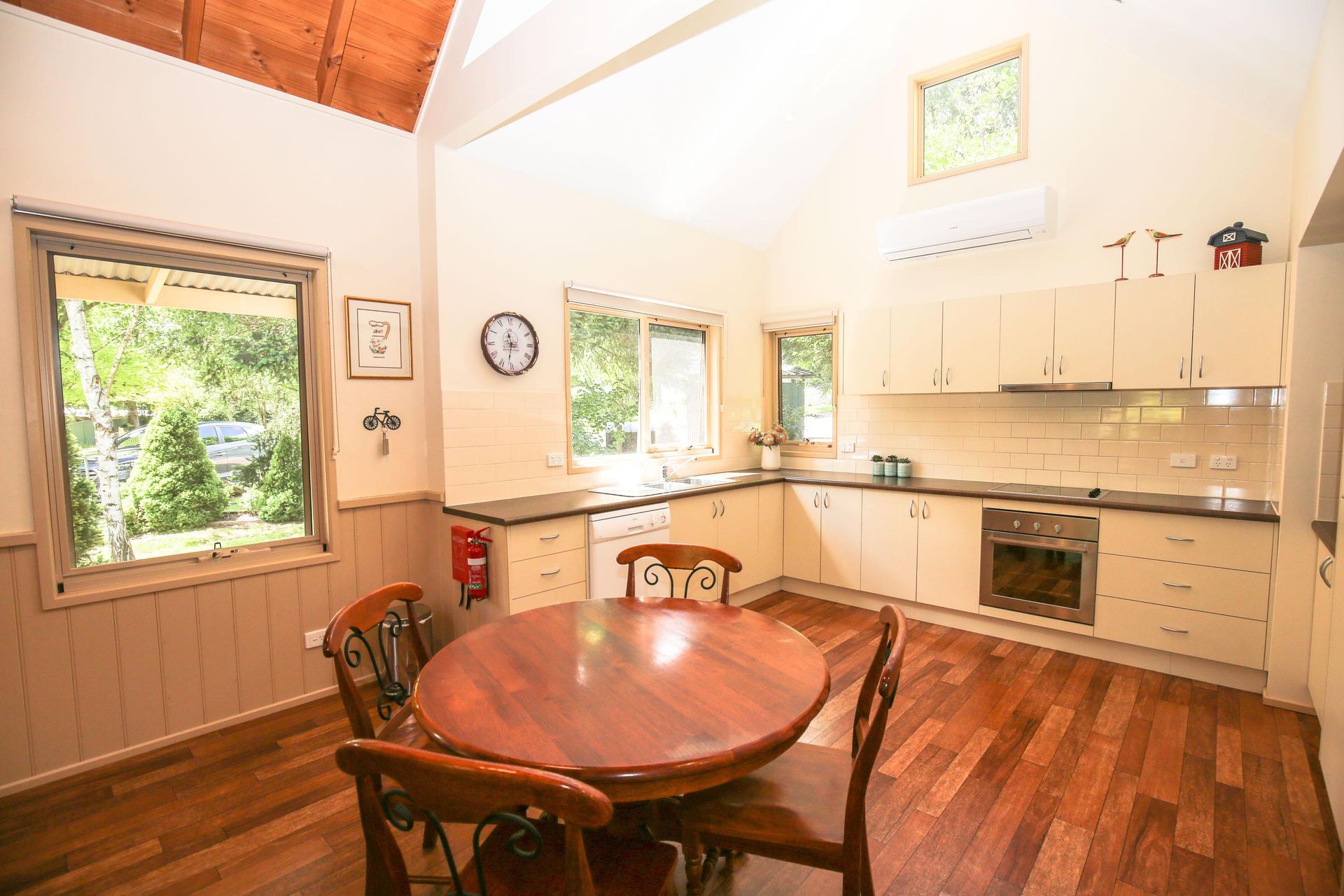 Alpine Arnica Cottage 1 features spacious open plan living with the warmth of a cosy cottage. Relax on the window seat with a good book as the sun pours in the through high windows or take in the fresh air from the verandah.