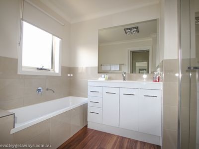 The main bathroom features a large shower and luxurious bath while the fully equipped laundry assists with easy living.