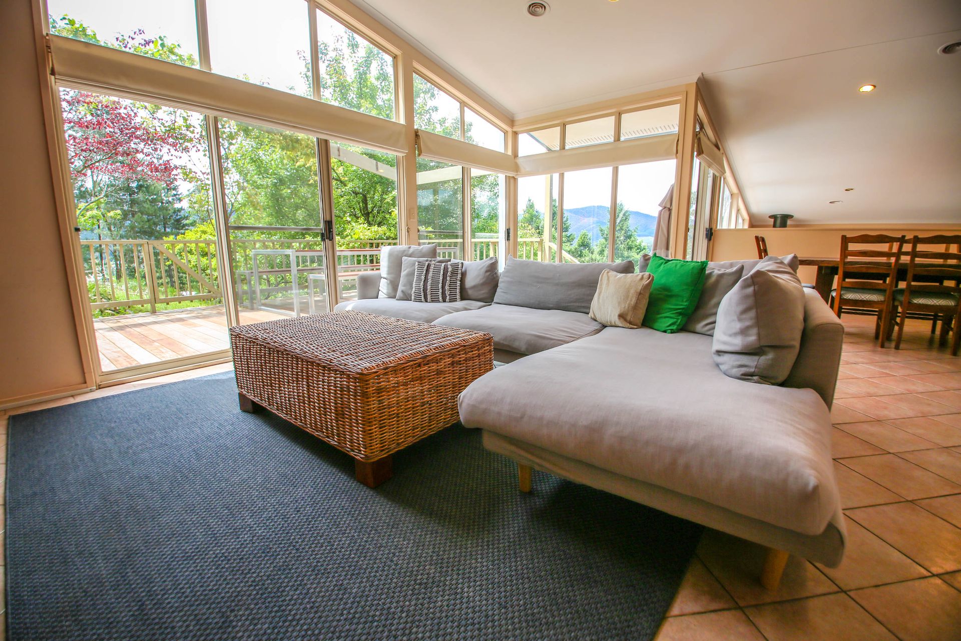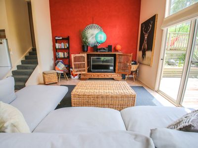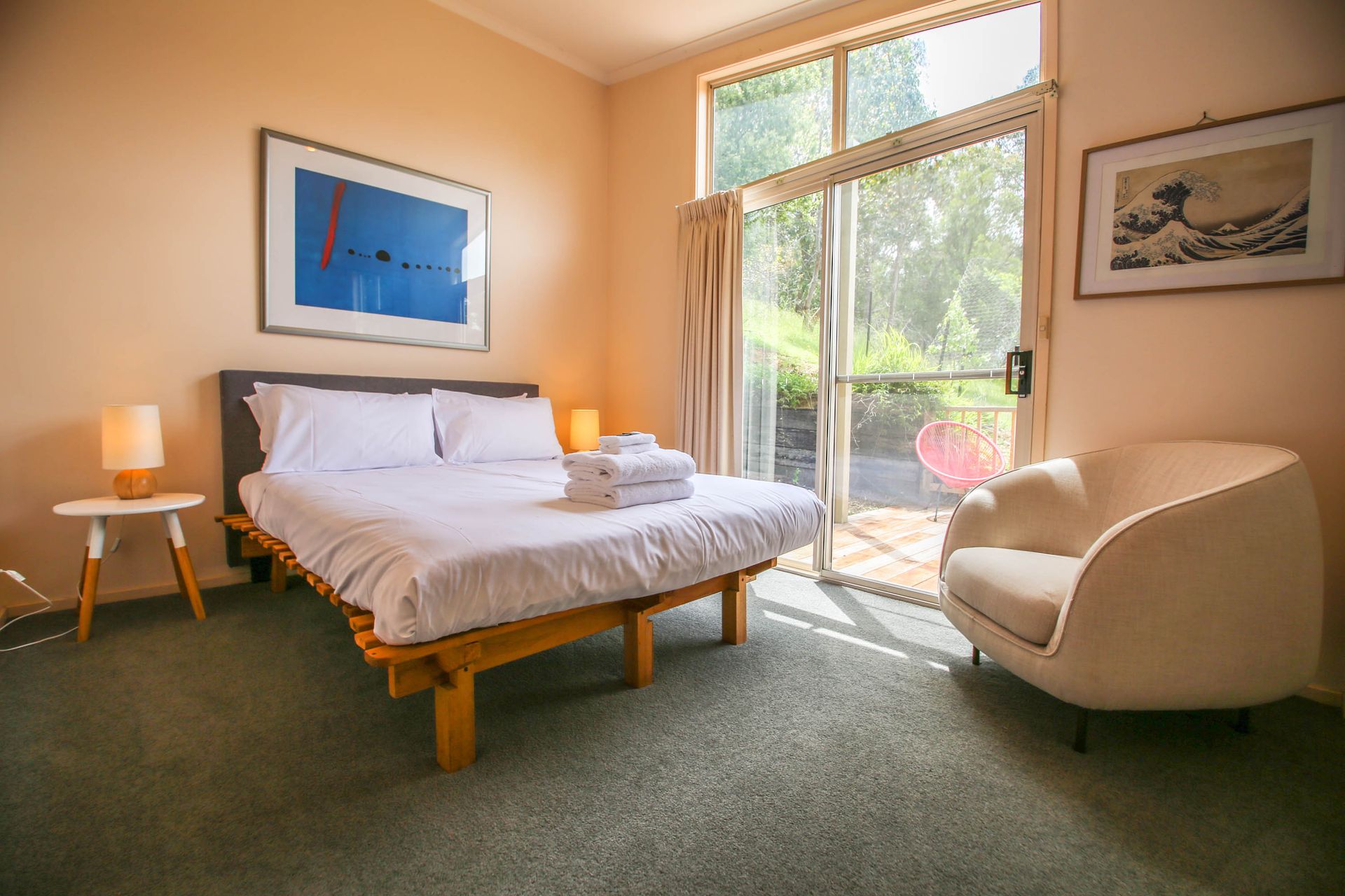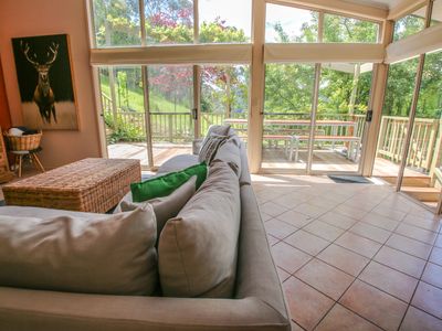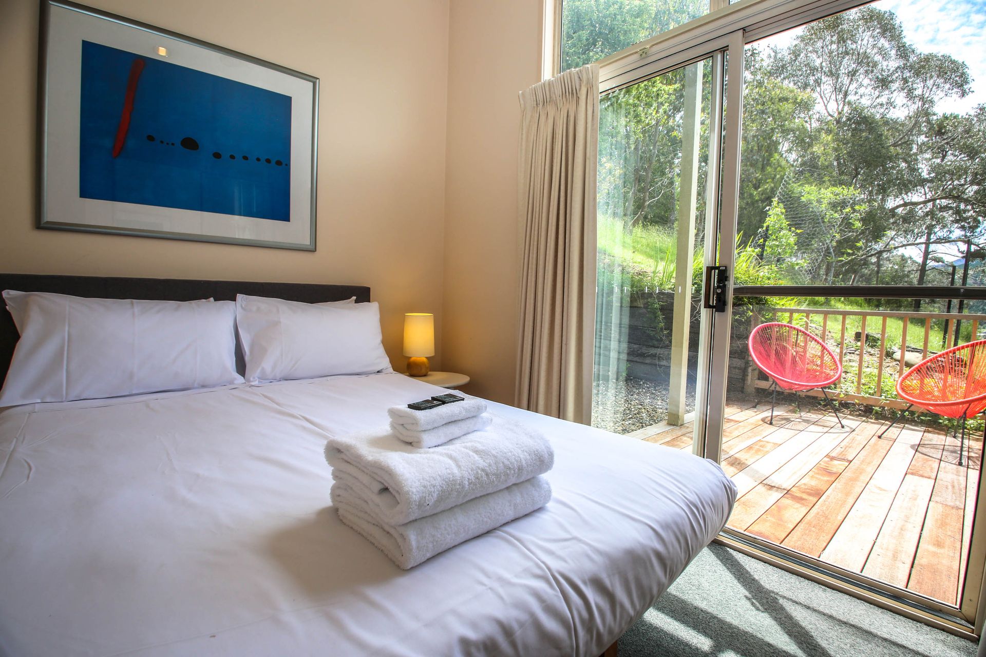 Four spacious bedrooms sleep 10 guests (including 2 trundles). The roomy master bedroom offers those stunning views with comfy recliner chairs to relax with a good book and a comfy queen bed. At the top end of the house, 3 more bedrooms offer a sunny queen bedroom with patio access, and 2 rooms with 2 single beds in each (+ 1 trundle). Limited linen is provided (see note below for full details), and all bedrooms feature robes and storage.