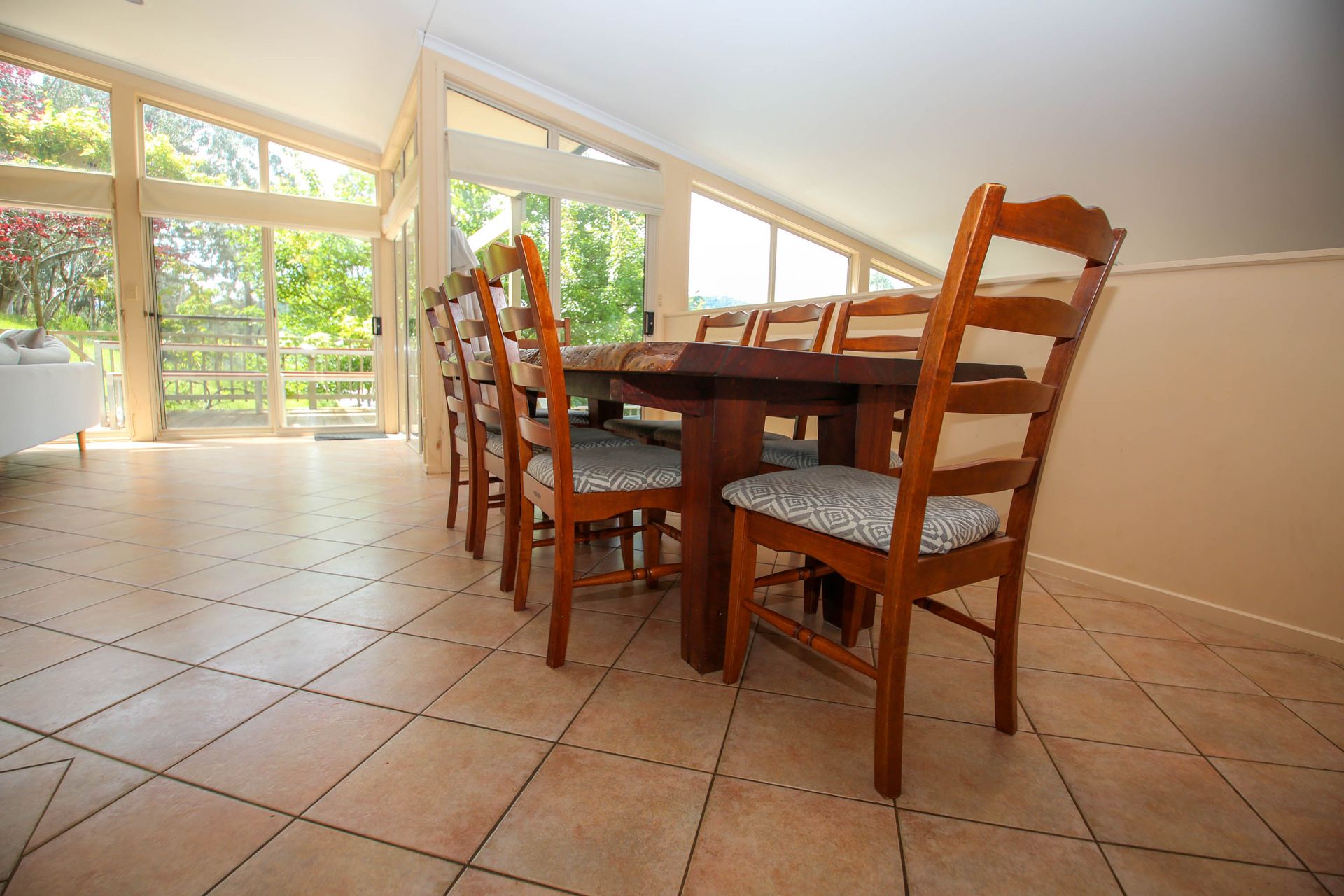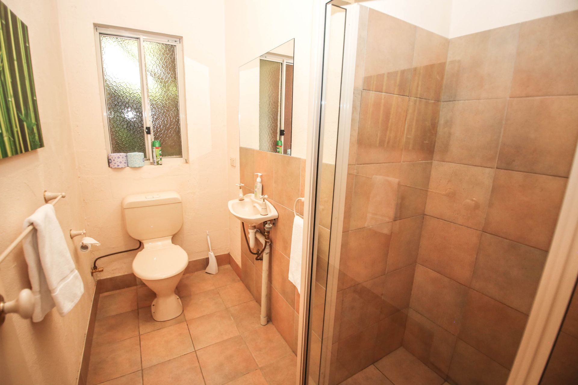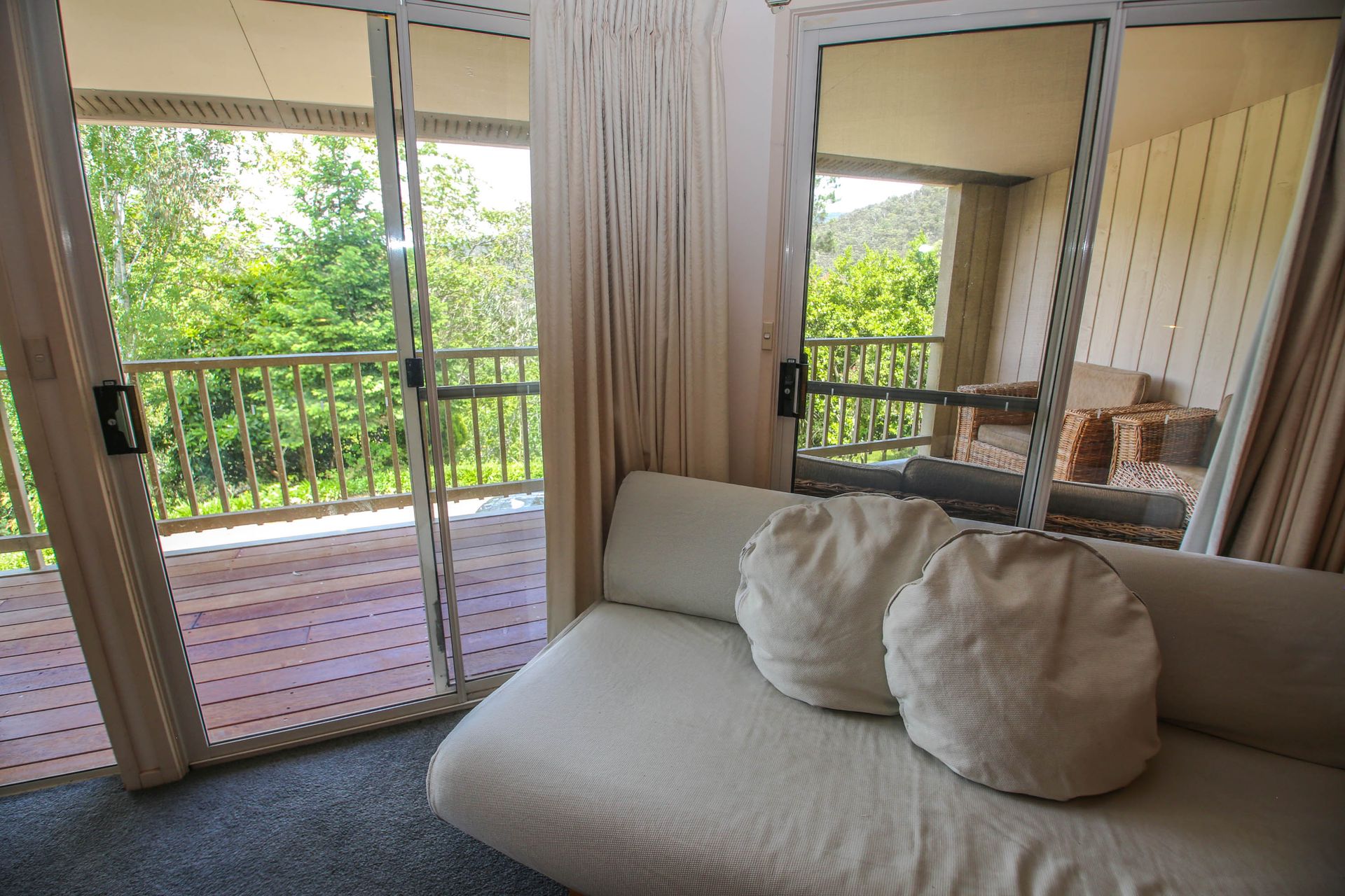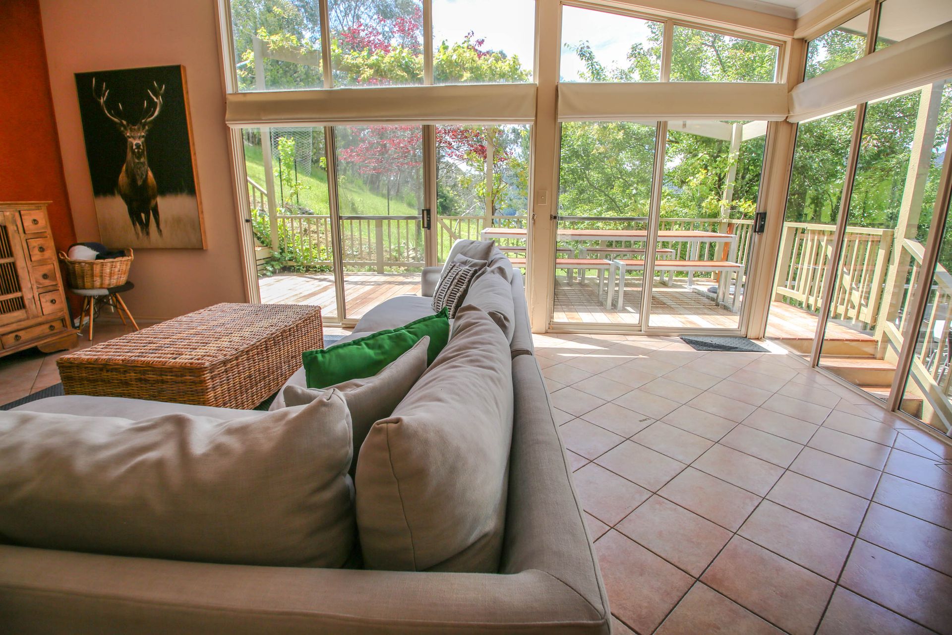 Four spacious bedrooms sleep 10 guests (including 2 trundles). The roomy master bedroom offers those stunning views with comfy recliner chairs to relax with a good book and a comfy queen bed. At the top end of the house, 3 more bedrooms offer a sunny queen bedroom with patio access, and 2 rooms with 2 single beds in each (+ 1 trundle). Limited linen is provided (see note below for full details), and all bedrooms feature robes and storage.
