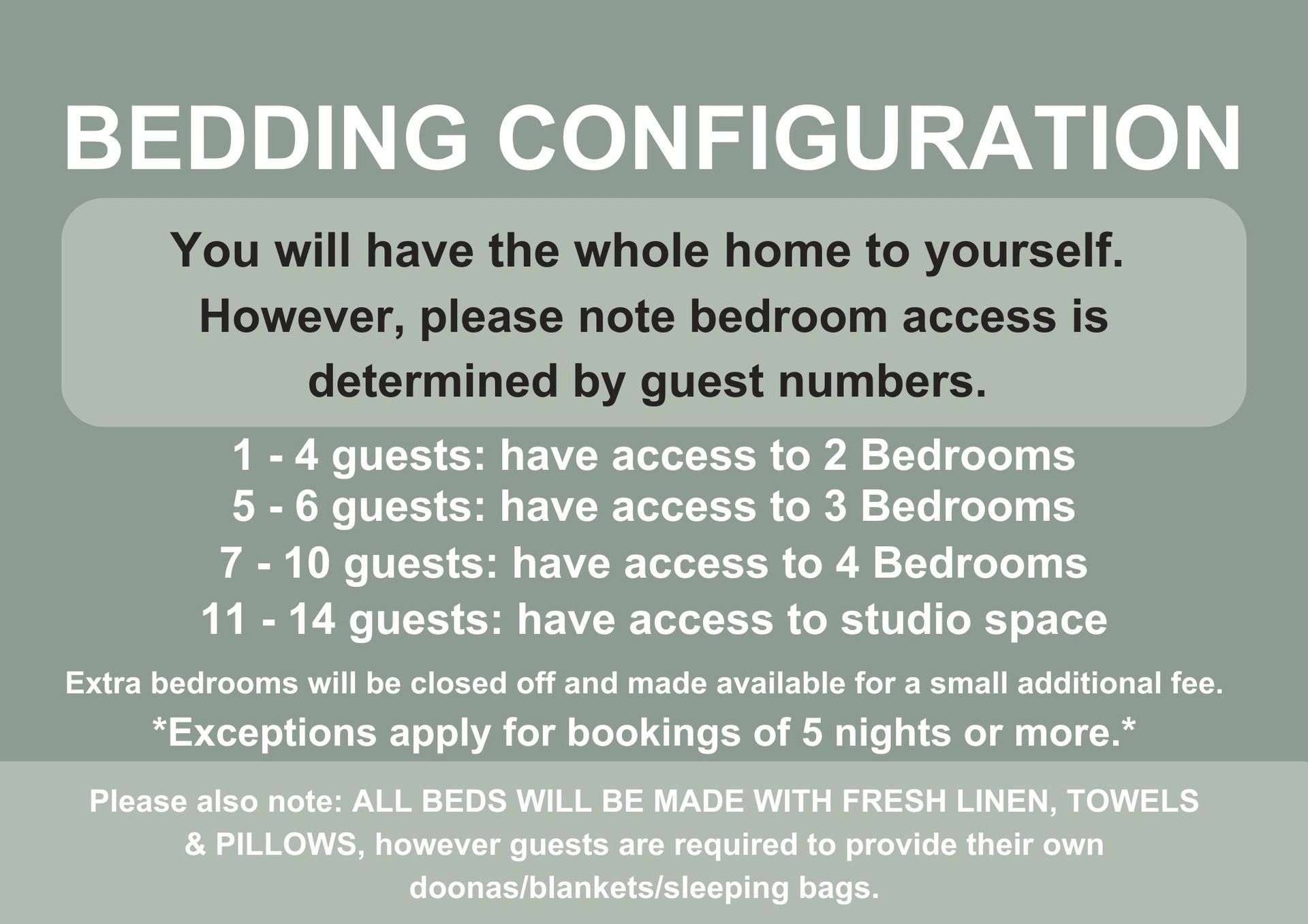 - Extra bedrooms will be closed off and can only be made available for a a small additional fee. * 1-2 guests offers 1 bedroom, 3-4 guests offers 2 bedrooms, 5-6 guests offers 3 bedrooms, 7-10 guests offers 4 bedrooms. 11-14 guests offers access to the studio space. Exceptions may apply for bookings of 5 nights or more.