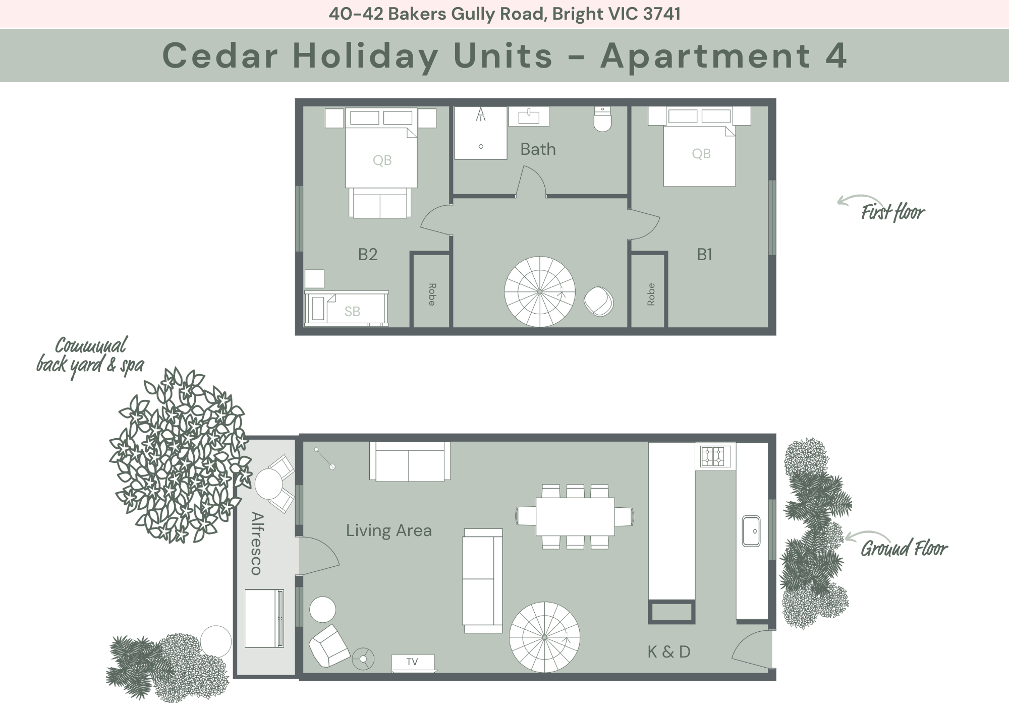 Offering multiple individual 2 bedroom townhouses - Cedar Holiday Units are the perfect escape with friends to enjoy Bright together with your own private spaces.