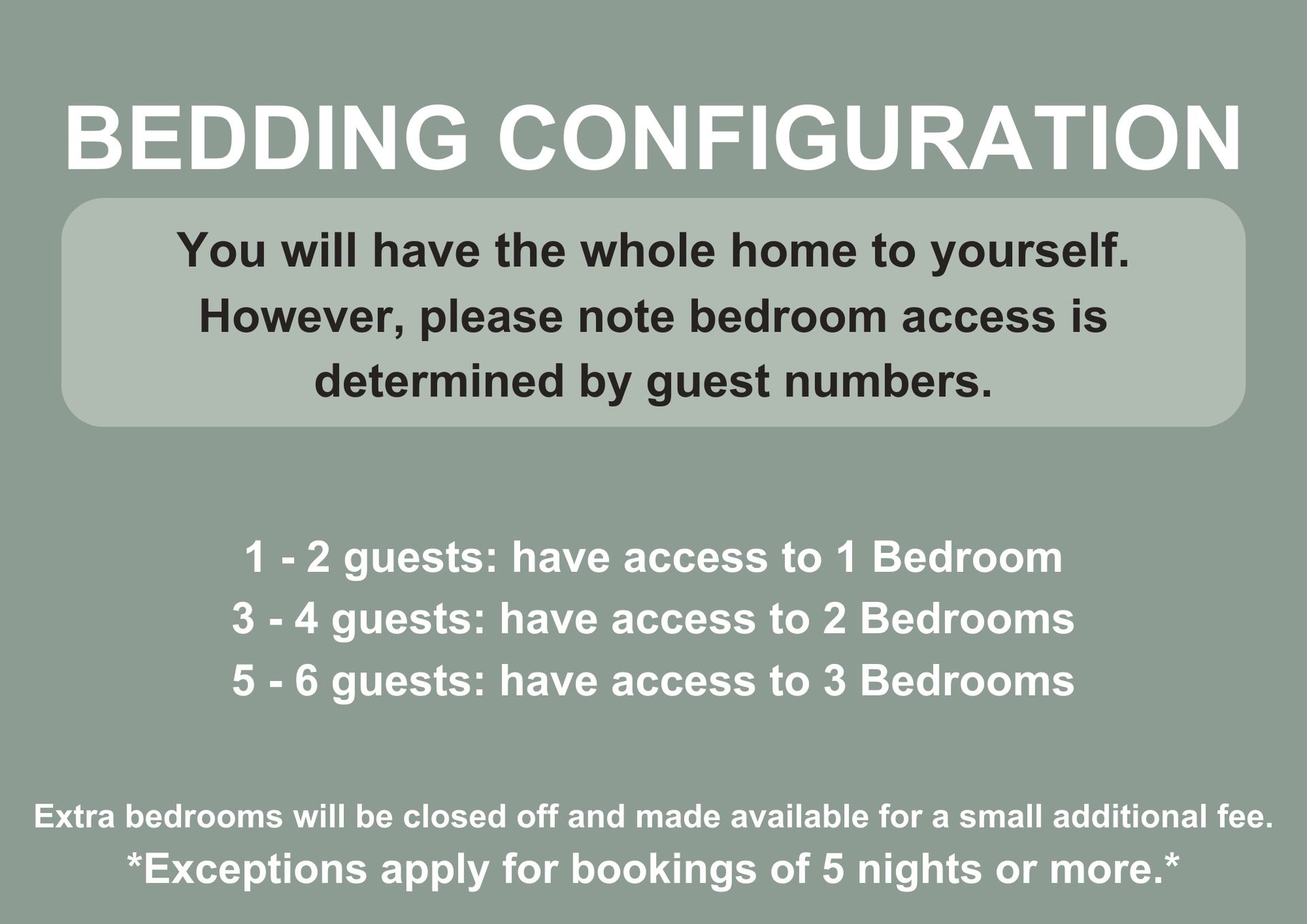 - Extra bedrooms will be closed off and can only be made available for a a small additional fee. * 1-2 guests offers 1 bedroom, 3-4 guests offers 2 bedrooms, 5-6 guests offers 3 bedrooms.
