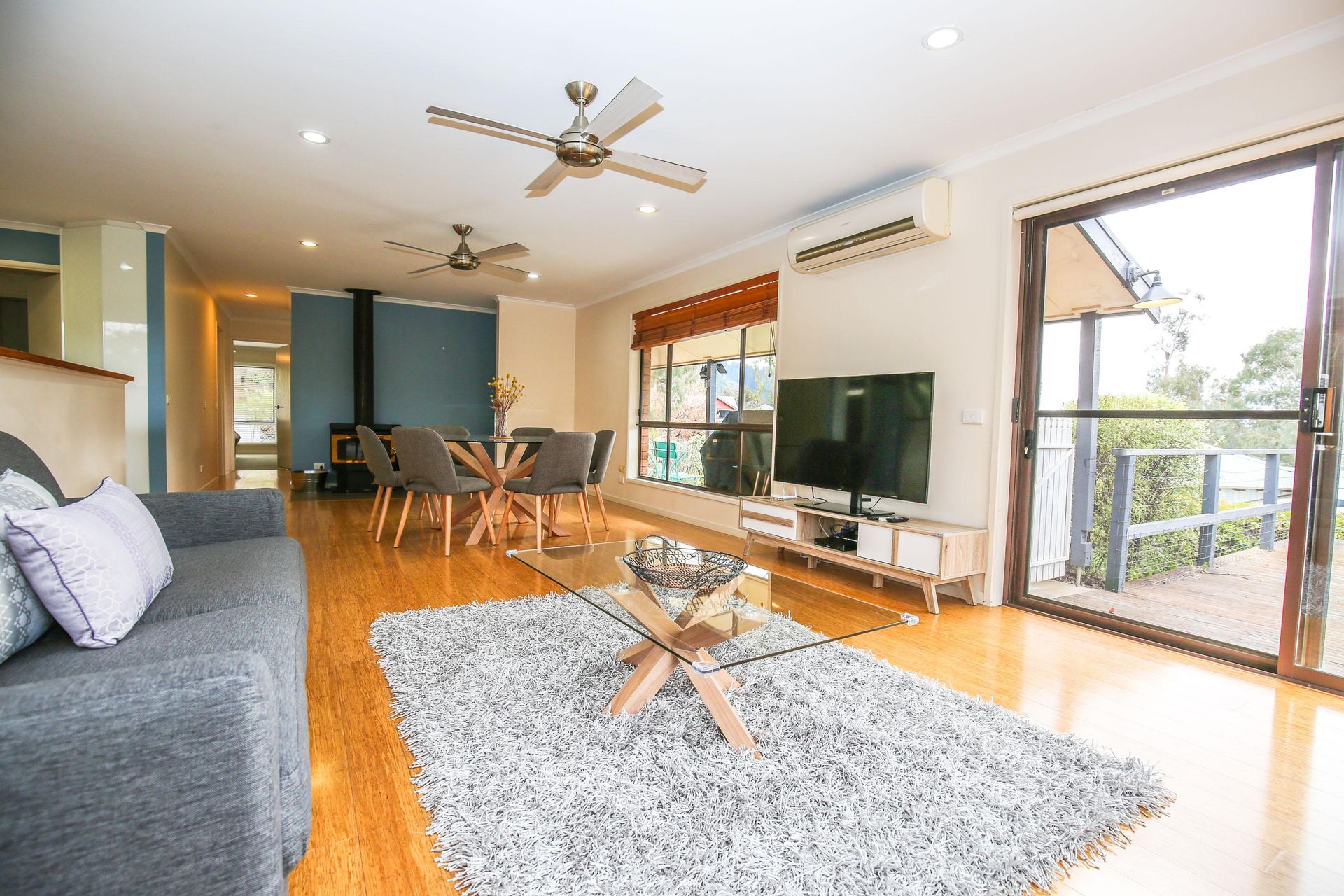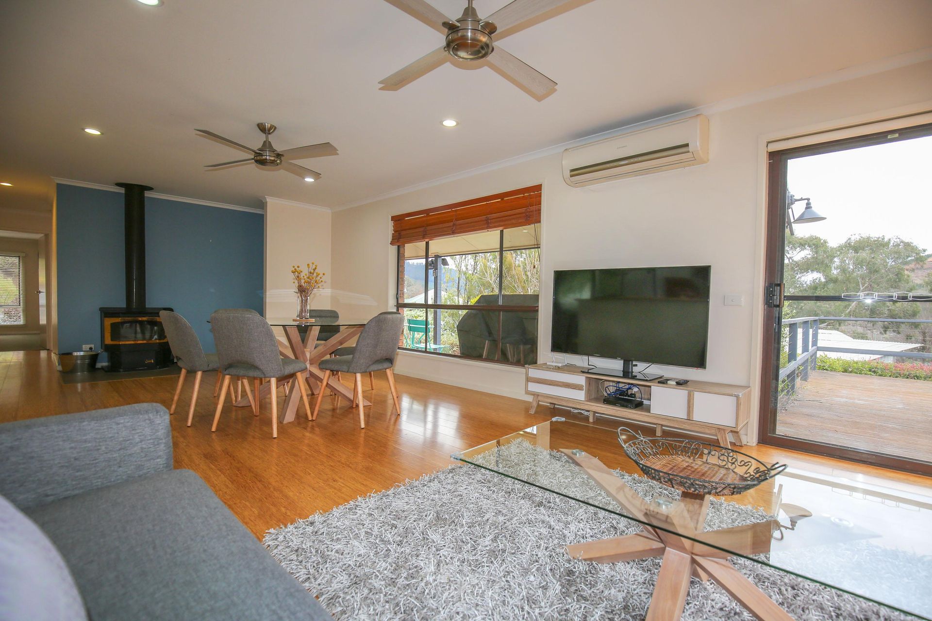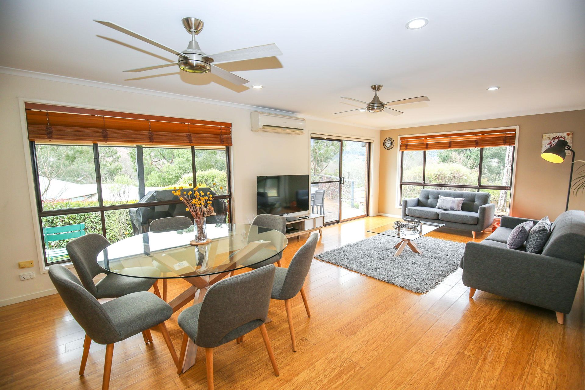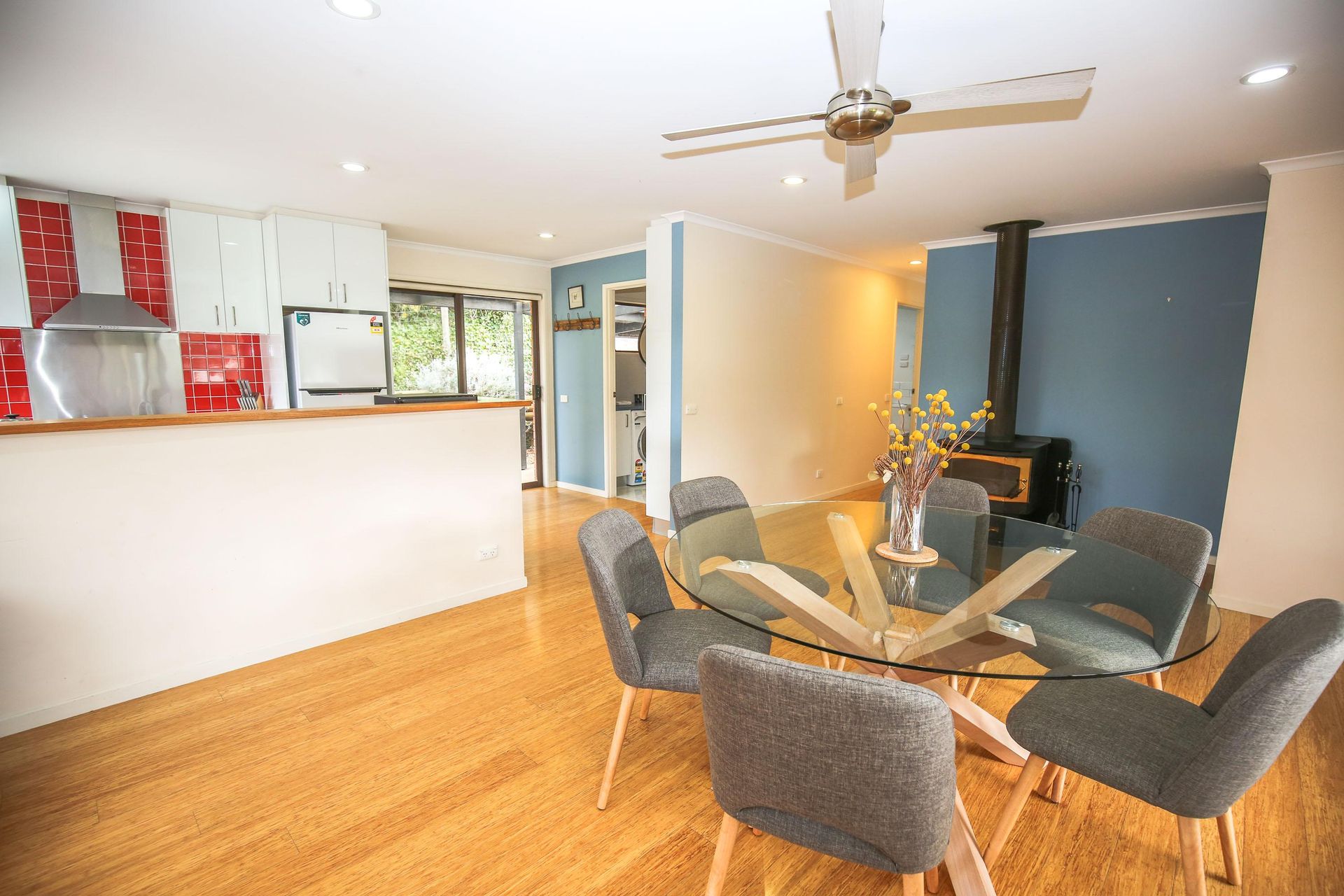 The sunny & open living space features a smart TV/DVD with WIFI provided. Congregate in the dining area by the enclosed wood fire or cool down under the split system in Summer.