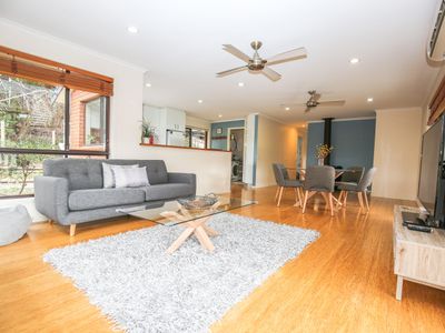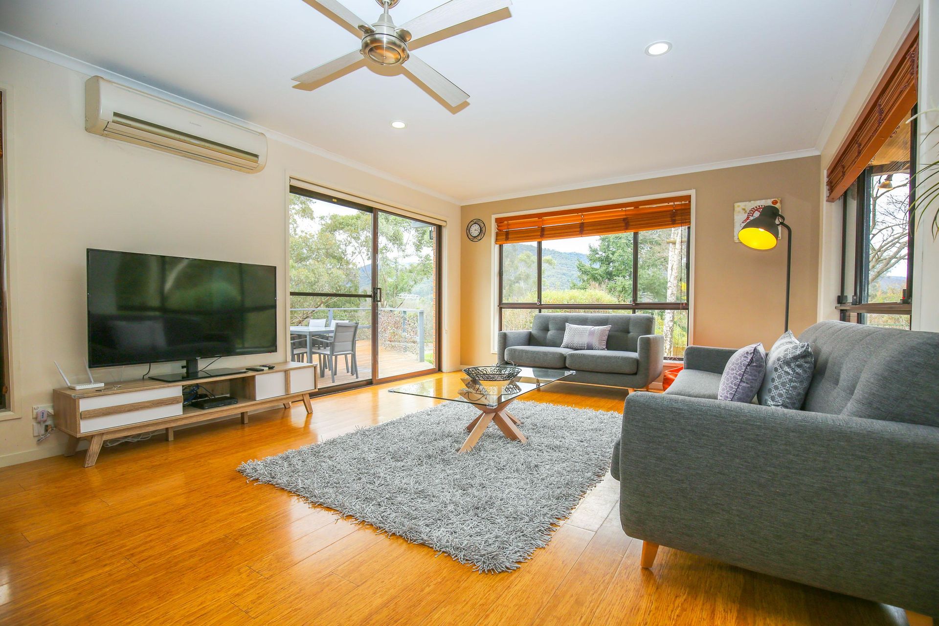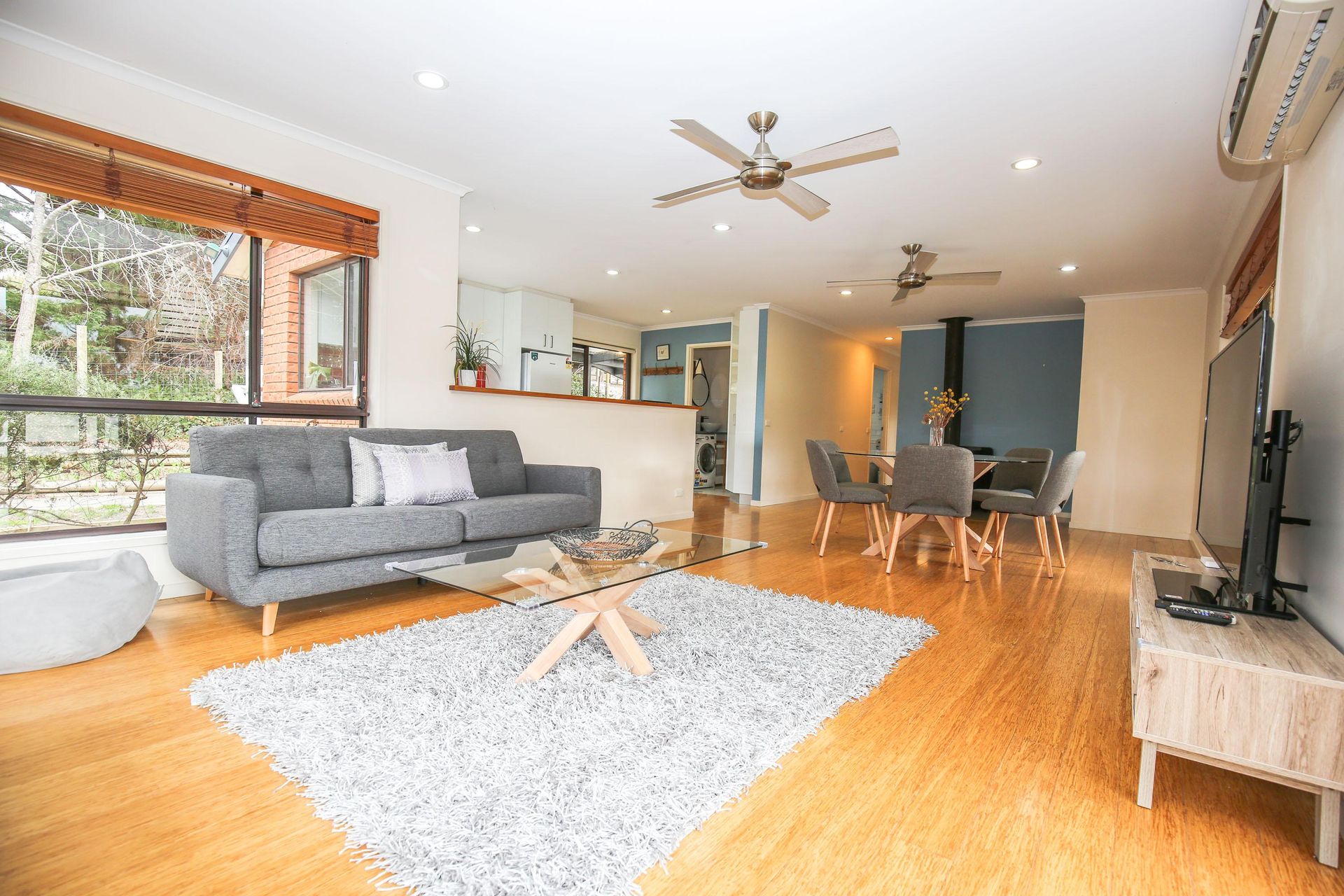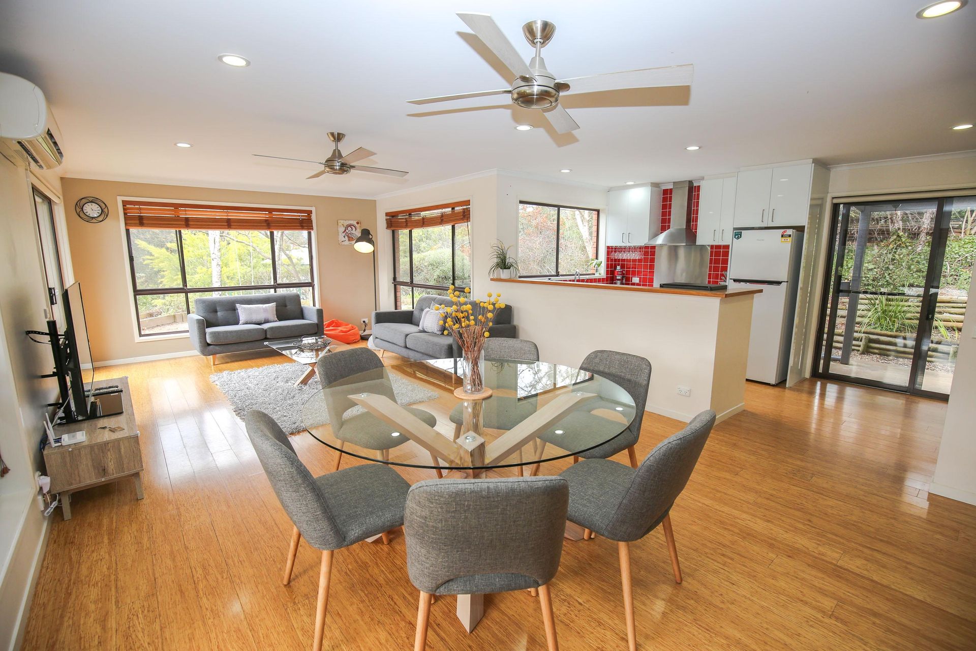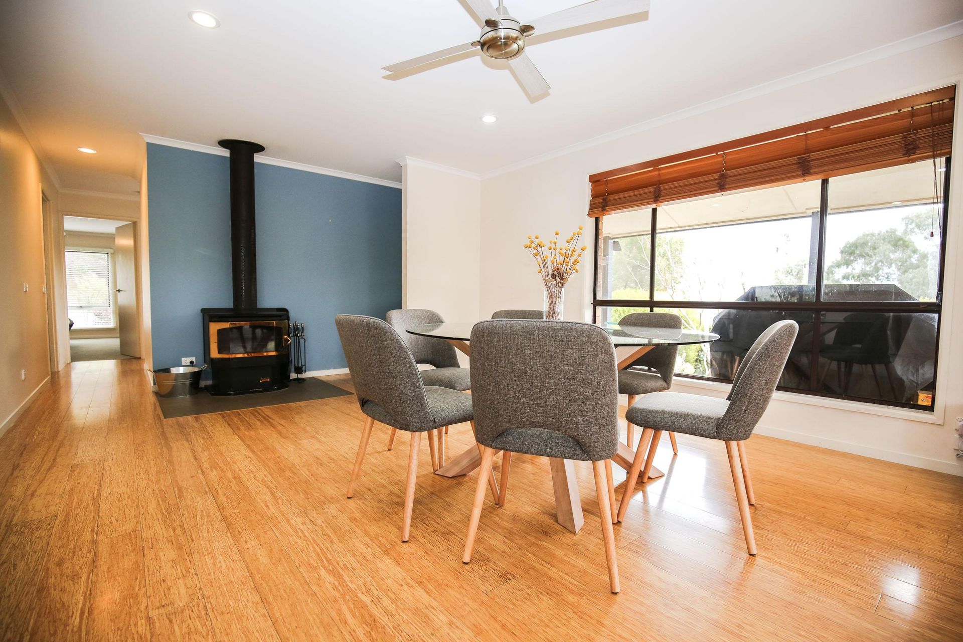 The sunny & open living space features a smart TV/DVD with WIFI provided. Congregate in the dining area by the enclosed wood fire or cool down under the split system in Summer.