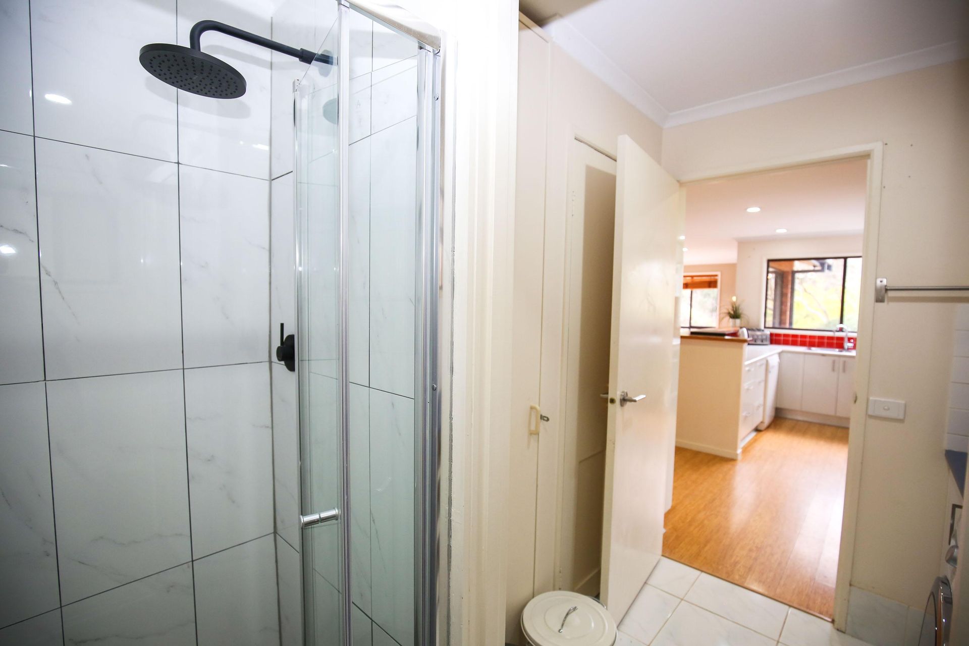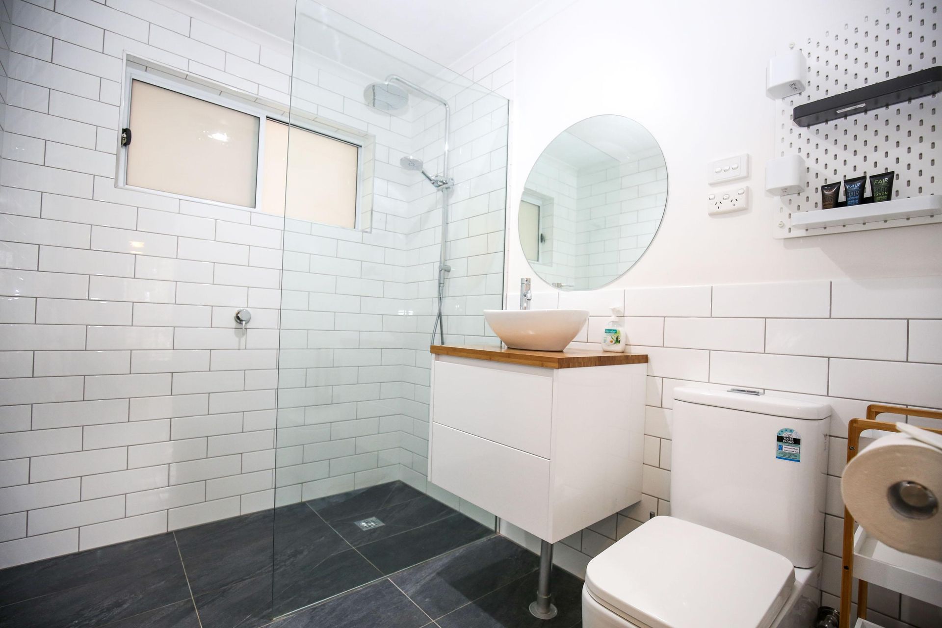 A modern master bathroom features a large open shower with luxe double rain shower head. A second bathroom with shower sits off your fully equipped laundry, so no queues needed!