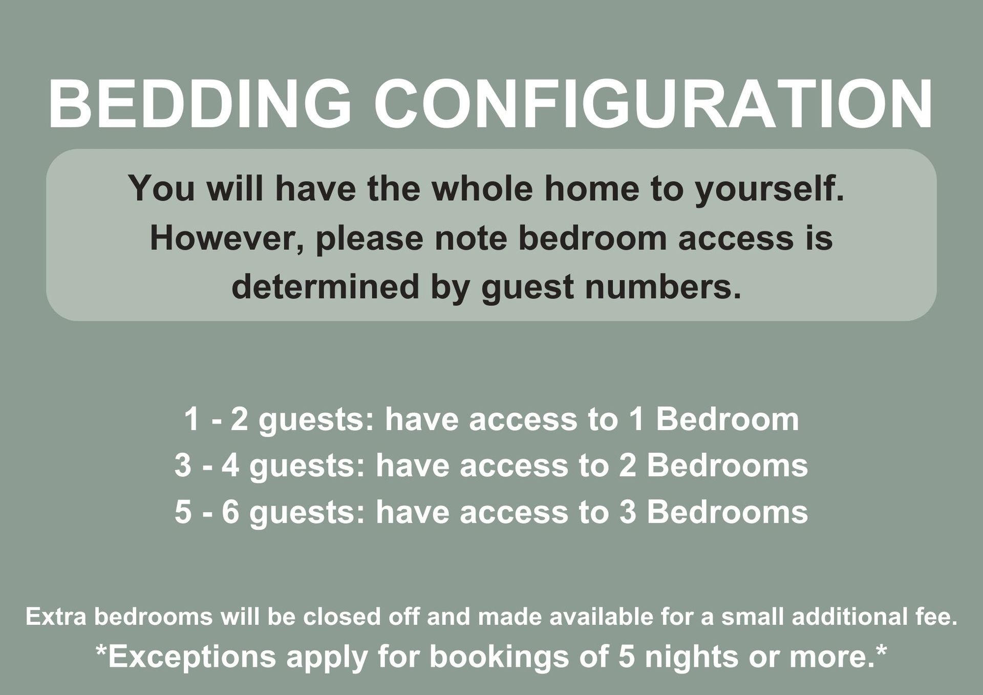 - Extra bedrooms will be closed off and can only be made available for a a small additional fee. * 1-2 guests offers 1 bedroom, 3-4 guests offers 2 bedrooms, 5-6 guests offers 3 bedrooms. Exceptions apply for bookings of 5 nights or more.