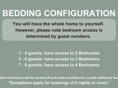 - Extra bedrooms will be closed off and can only be made available for a a small additional fee. * 1-4 guests offers 2 bedrooms, 5-6 guests offers 3 bedrooms, 7-8 guests offers 4 bedrooms. Exceptions apply for bookings of 5 nights or more. This property is suitable for a maximum of 7 adults.