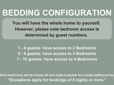 - Extra bedrooms will be closed off and can only be made available for a a small additional fee. * 1-2 guests offers 1 bedroom, 3-4 guests offers 2 bedrooms, 5-6 guests offers 3 bedrooms, 7-10 guests offers 4 bedrooms. Exceptions apply for bookings of 5 nights or more.