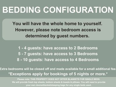 Extra bedrooms will be closed off and can only be made available for a a small additional fee. 1-2 guests offers 1 bedroom, 3-4 guests offers 2 bedrooms, 5-7 guests offers 3 bedrooms, 8-10 guests offers 4 bedrooms.
