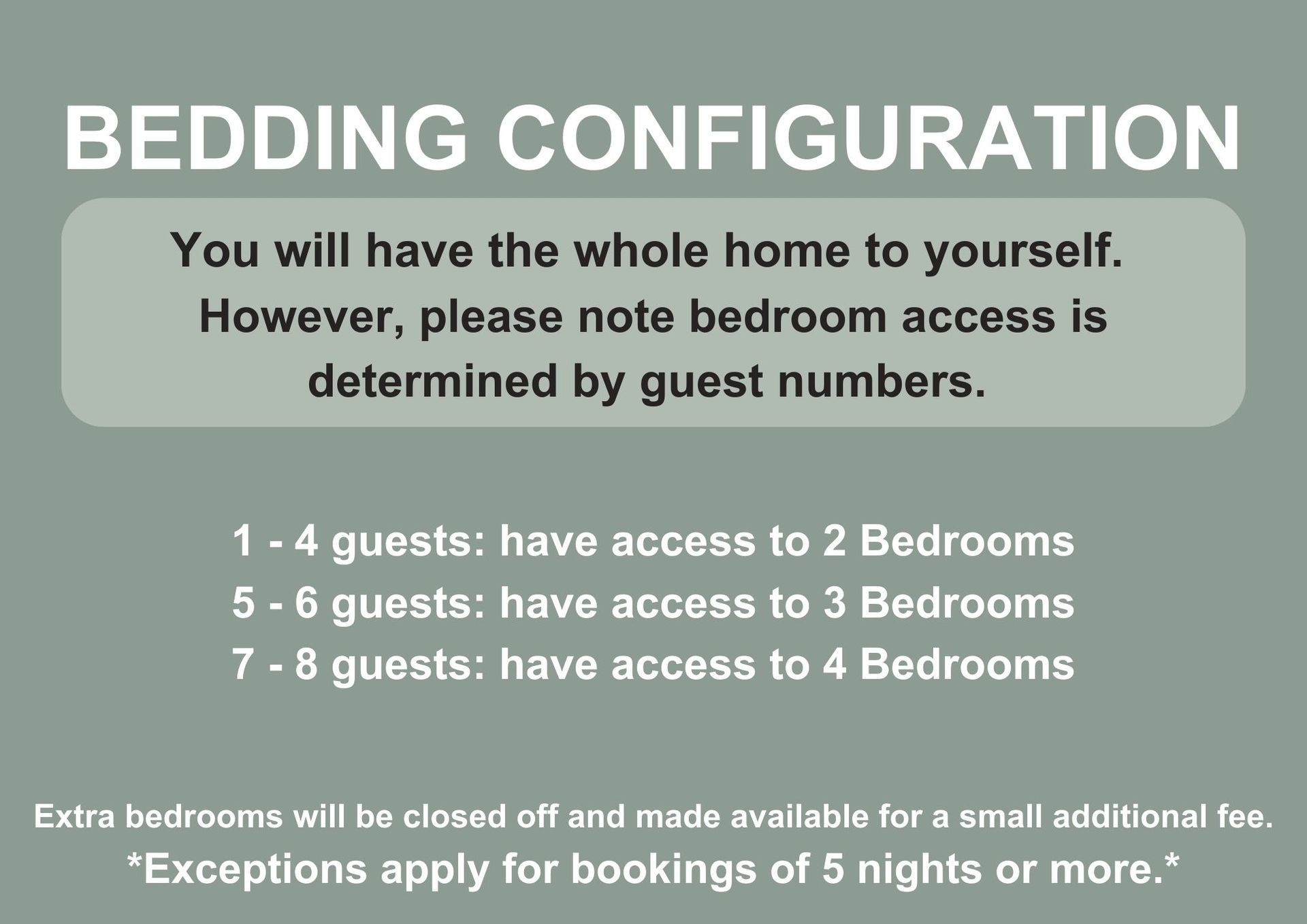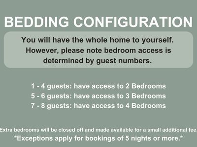 Extra bedrooms available for a small additional fee - Exceptions apply for bookings of 5 nights or more.