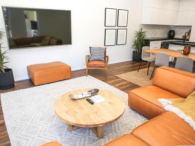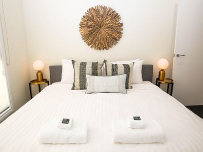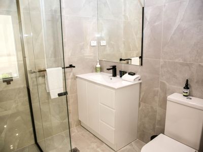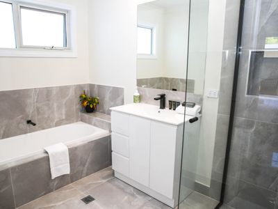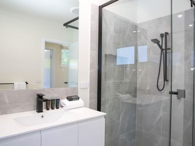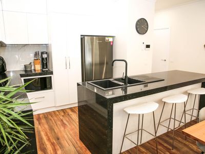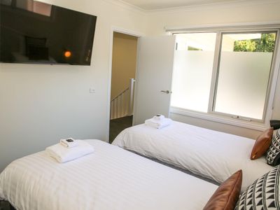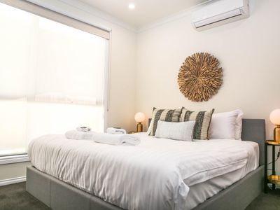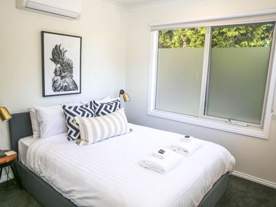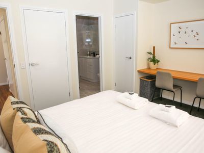 The master bedroom is downstairs and has a king bed, its own ensuite, walk in wardrobe and built-in double desk, ideal if you need to hide away and get some work done. The other 2 bedrooms are upstairs, one with a queen bed & the other with 2 king single beds. Each room has ample storage for you to really settle in and make yourself at home.