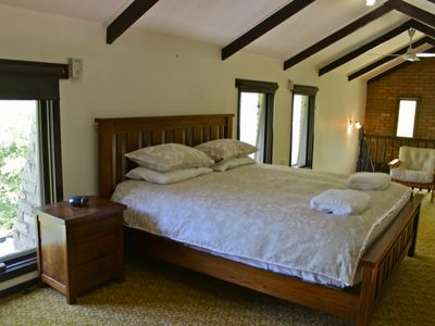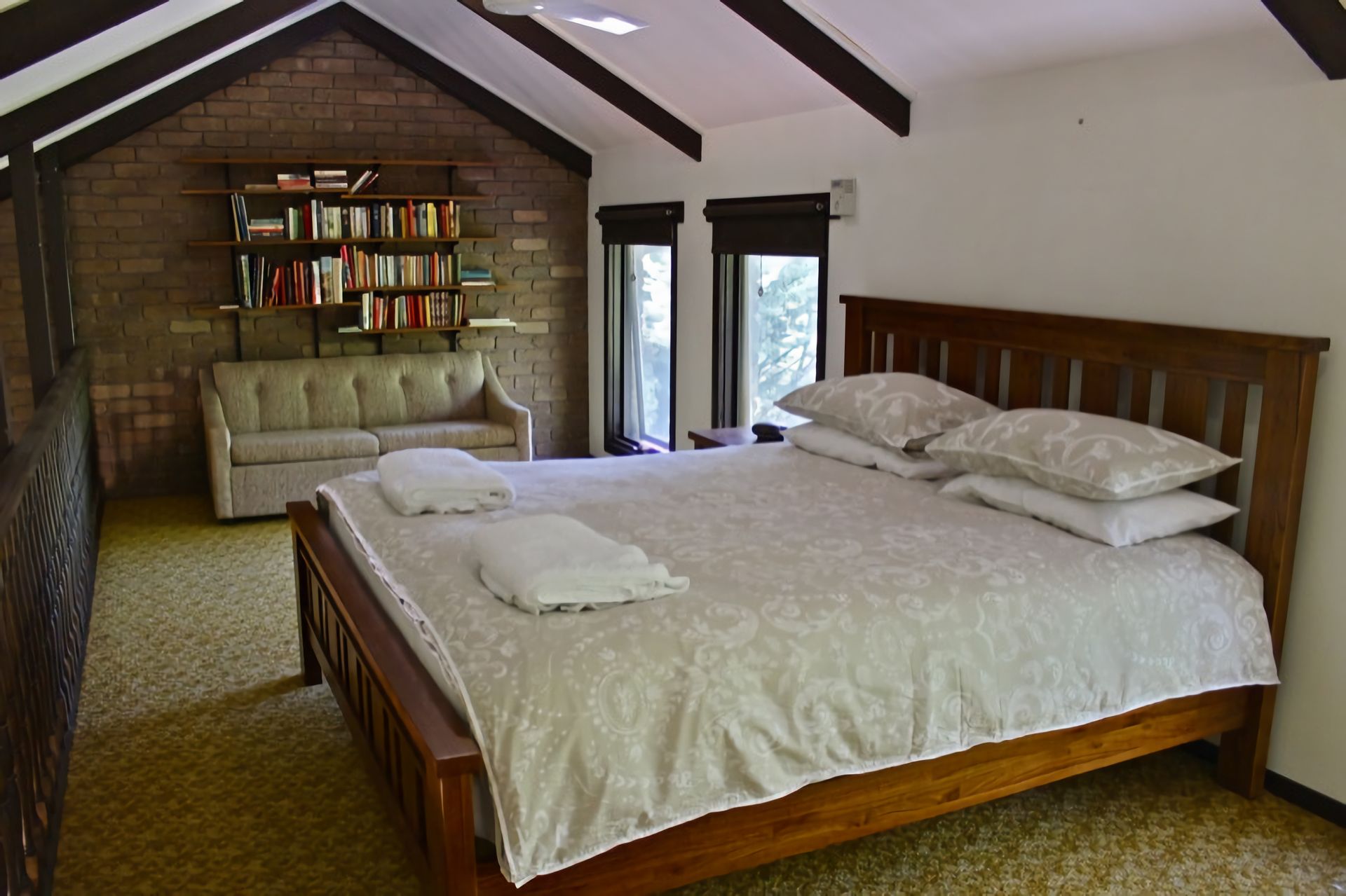 The loft style bedroom features a king bed with all bedding & linen provided as well as an extensive library to while away the days.