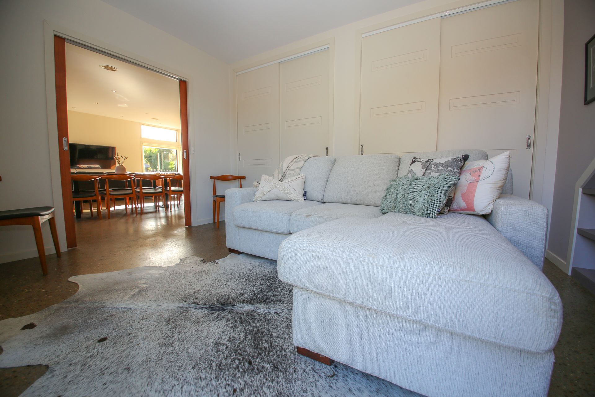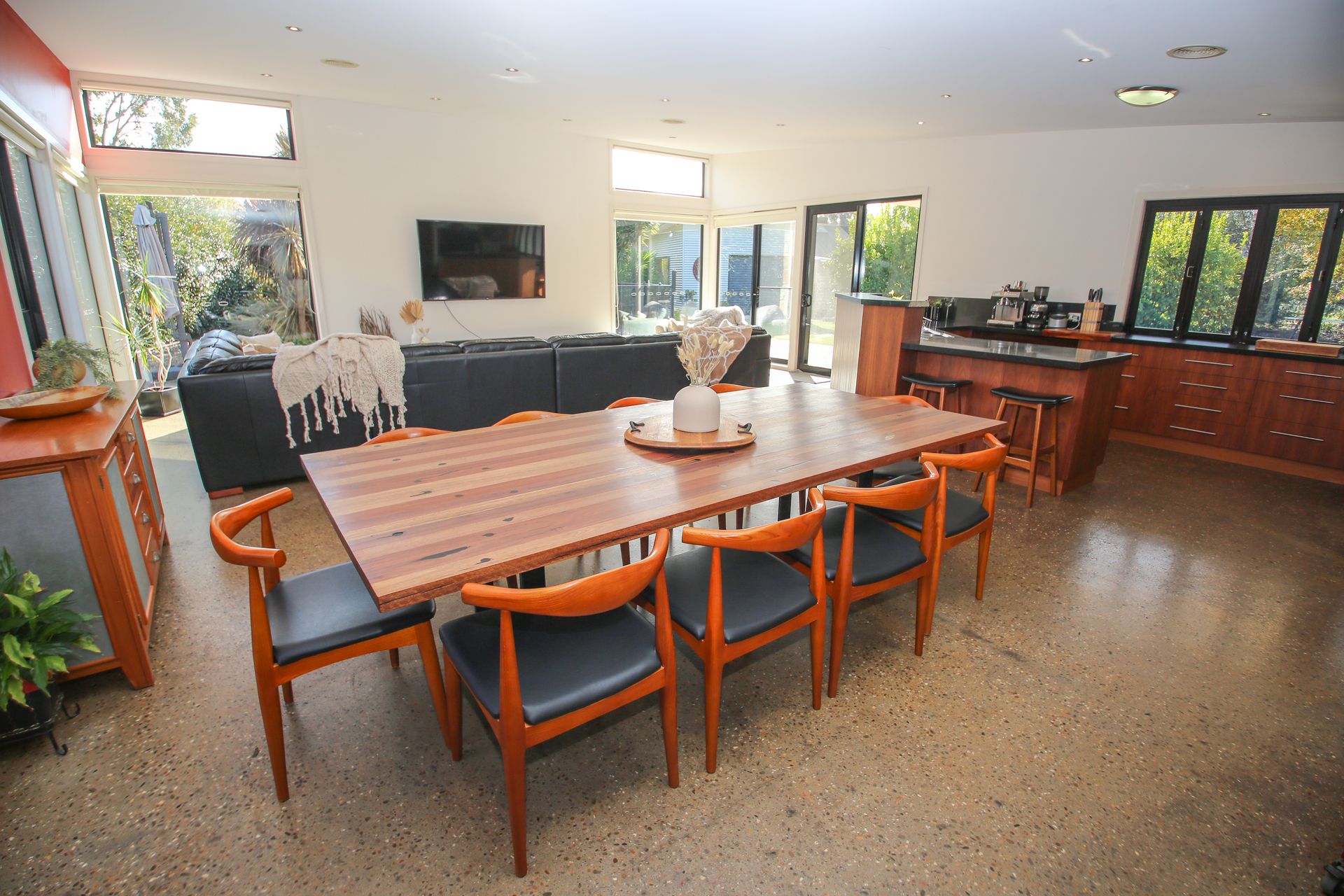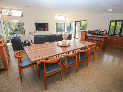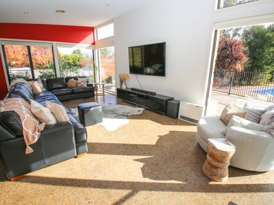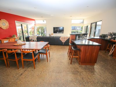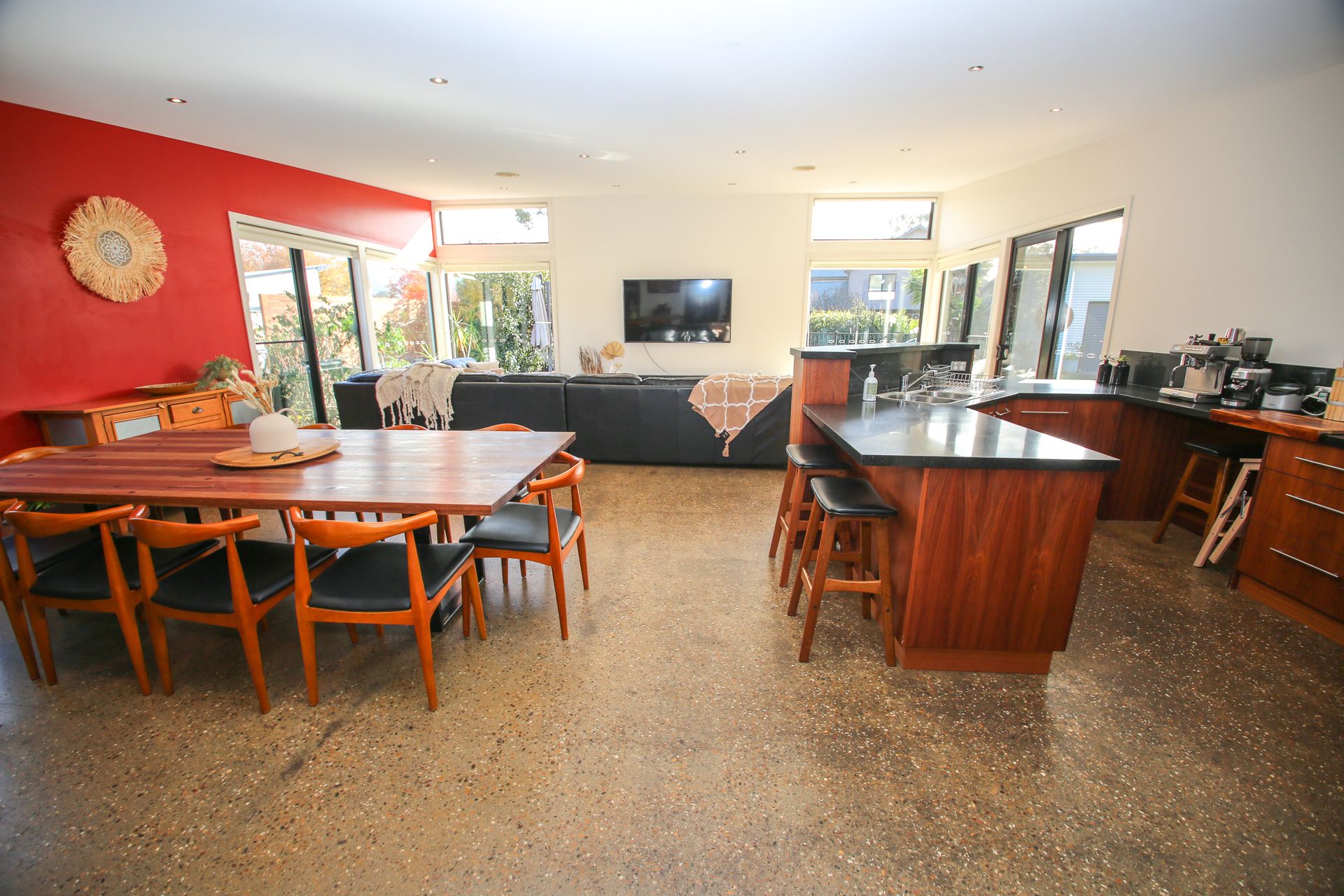 The open plan living area is decked out with a huge 8-seater modular couch, sprawled in front of a massive wall mounted TV for movie nights for the whole tribe. The dining area is also complete with a dining table for 8 and the kitchen equipped with all the mod cons you could dream of to whip up those family feasts.