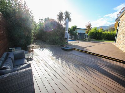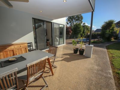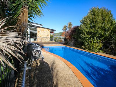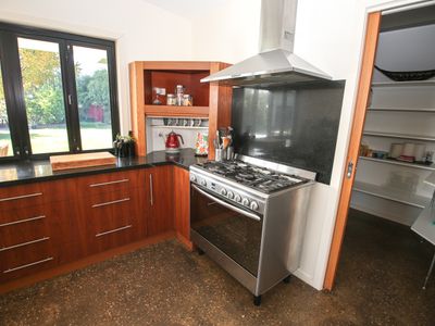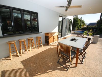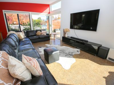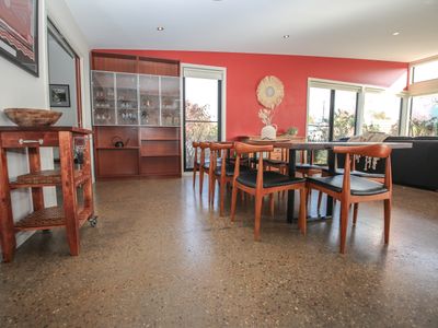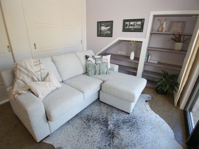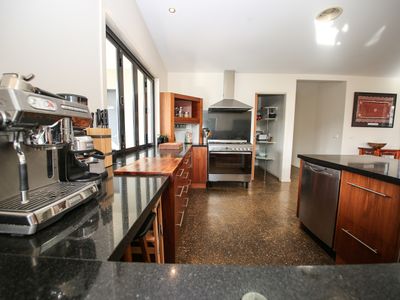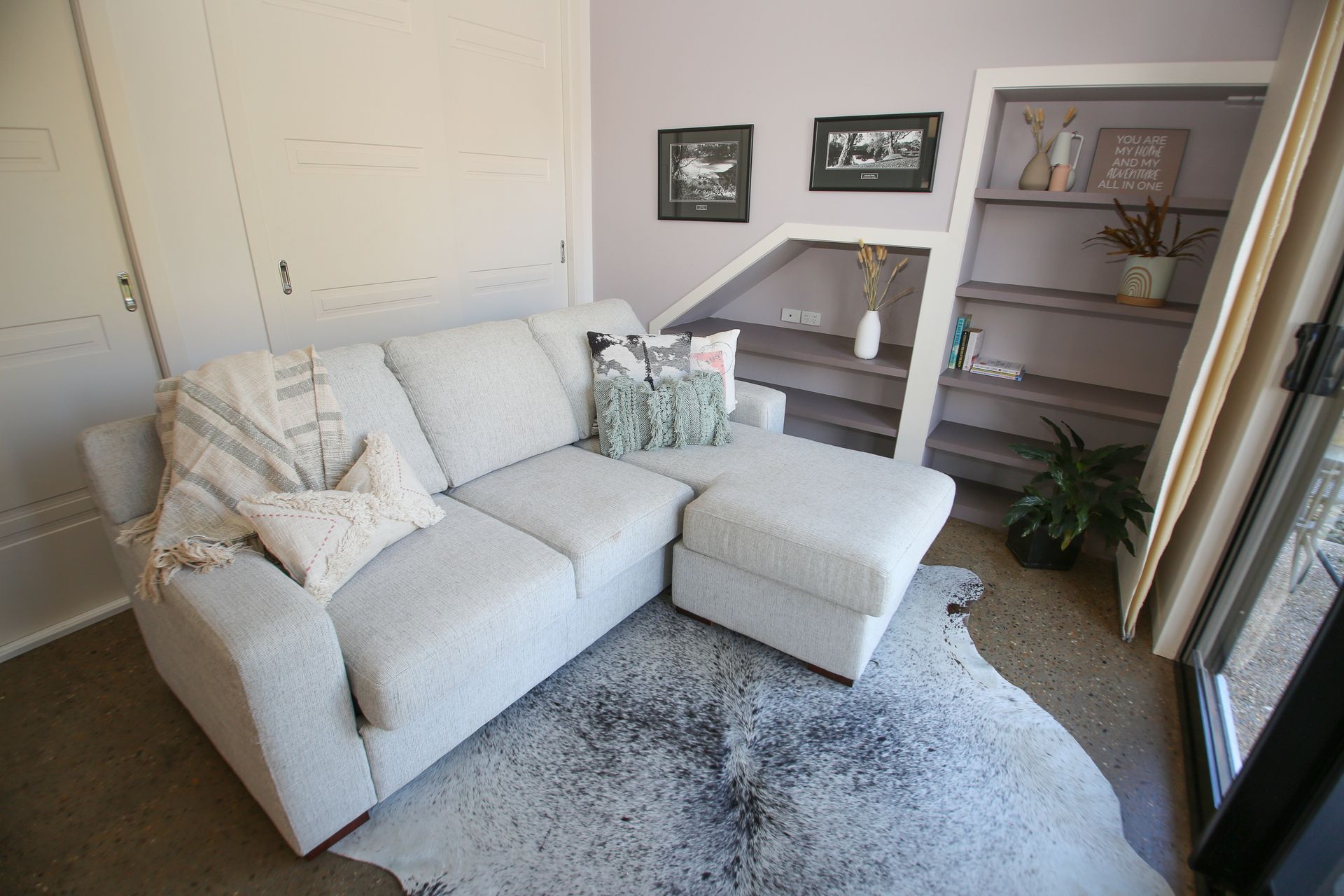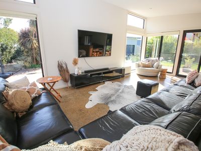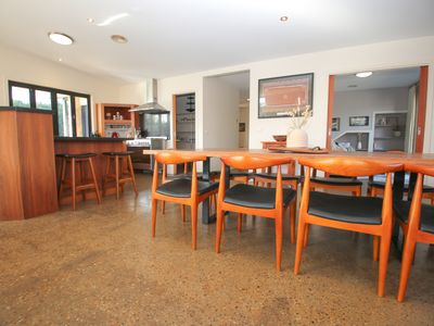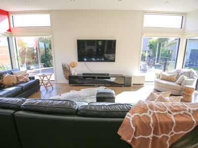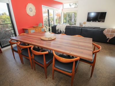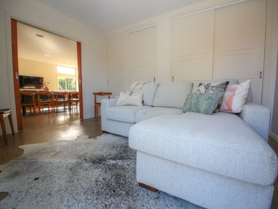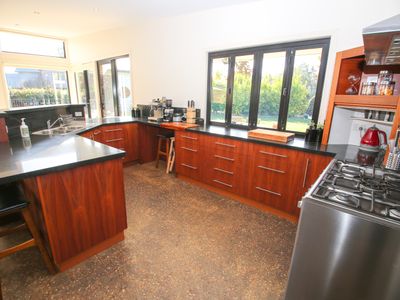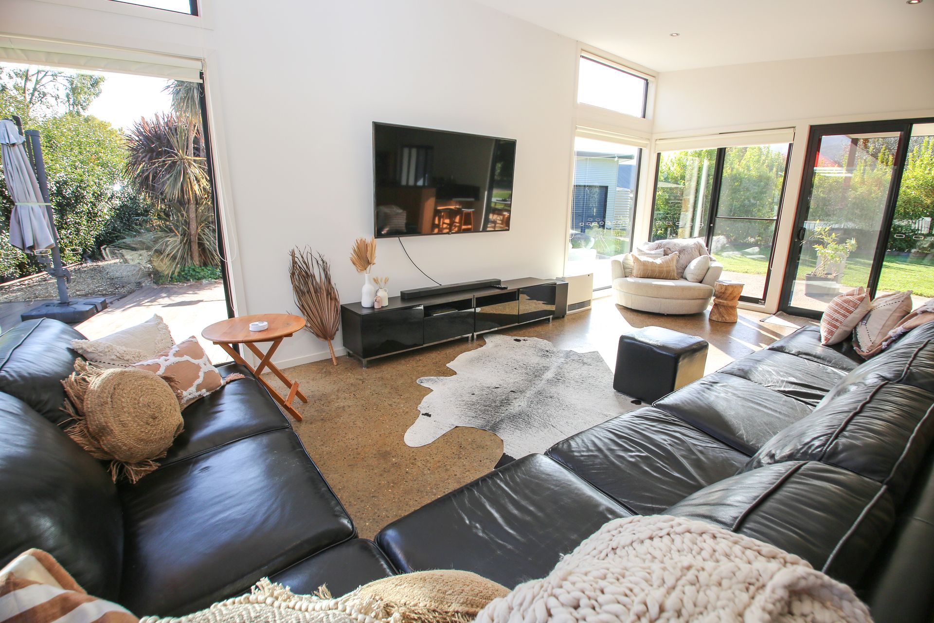 The open plan living area is decked out with a huge 8-seater modular couch, sprawled in front of a massive wall mounted TV for movie nights for the whole tribe. The dining area is also complete with a dining table for 8 and the kitchen equipped with all the mod cons you could dream of to whip up those family feasts.