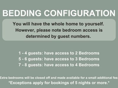 • Extra bedrooms will be closed off and can only be made available for a a small additional fee. * 1-4 guests offers 2 bedrooms, 5-6 guests offers 3 bedrooms, 7-8 guests offers 4 bedrooms.. Exceptions apply for bookings of 5 nights or more.