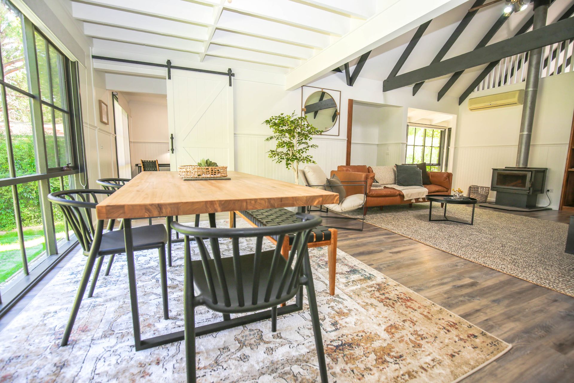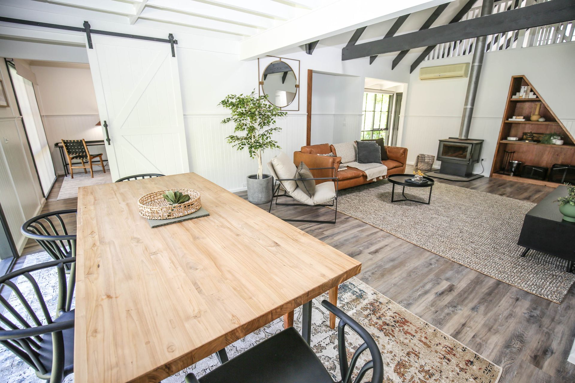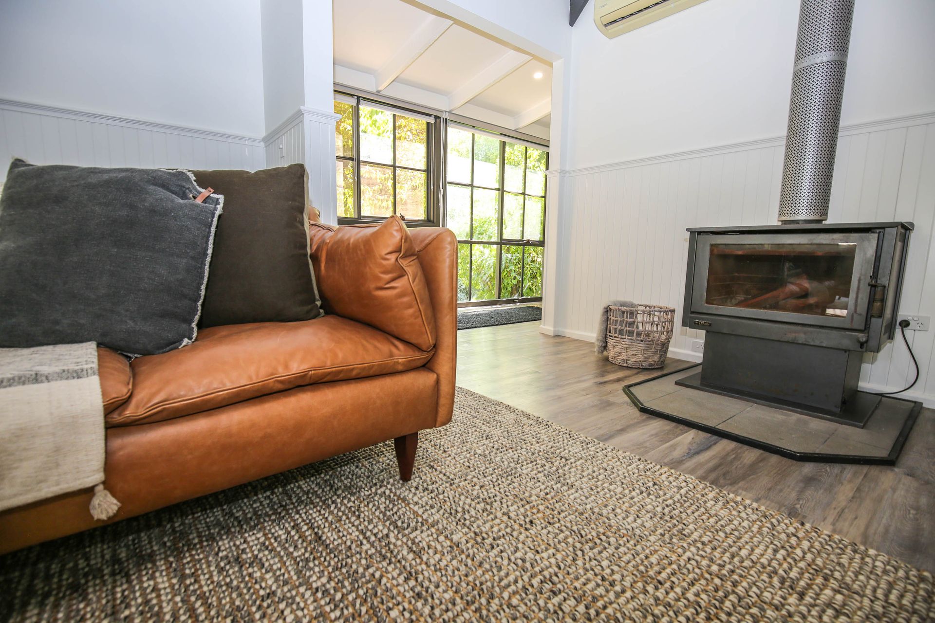 Inside, the home features a comfortable living area with a free standing woodfire, massive TV, plush seating, and a large dining table. The kitchen is fully equipped with everything you need to prepare meals during your stay, including a stove, oven, refrigerator, and microwave & lots of little extras.