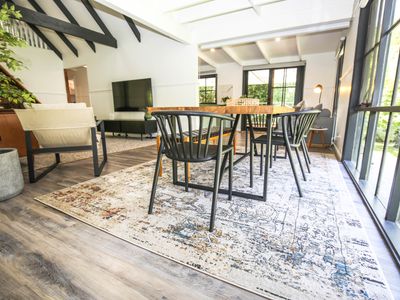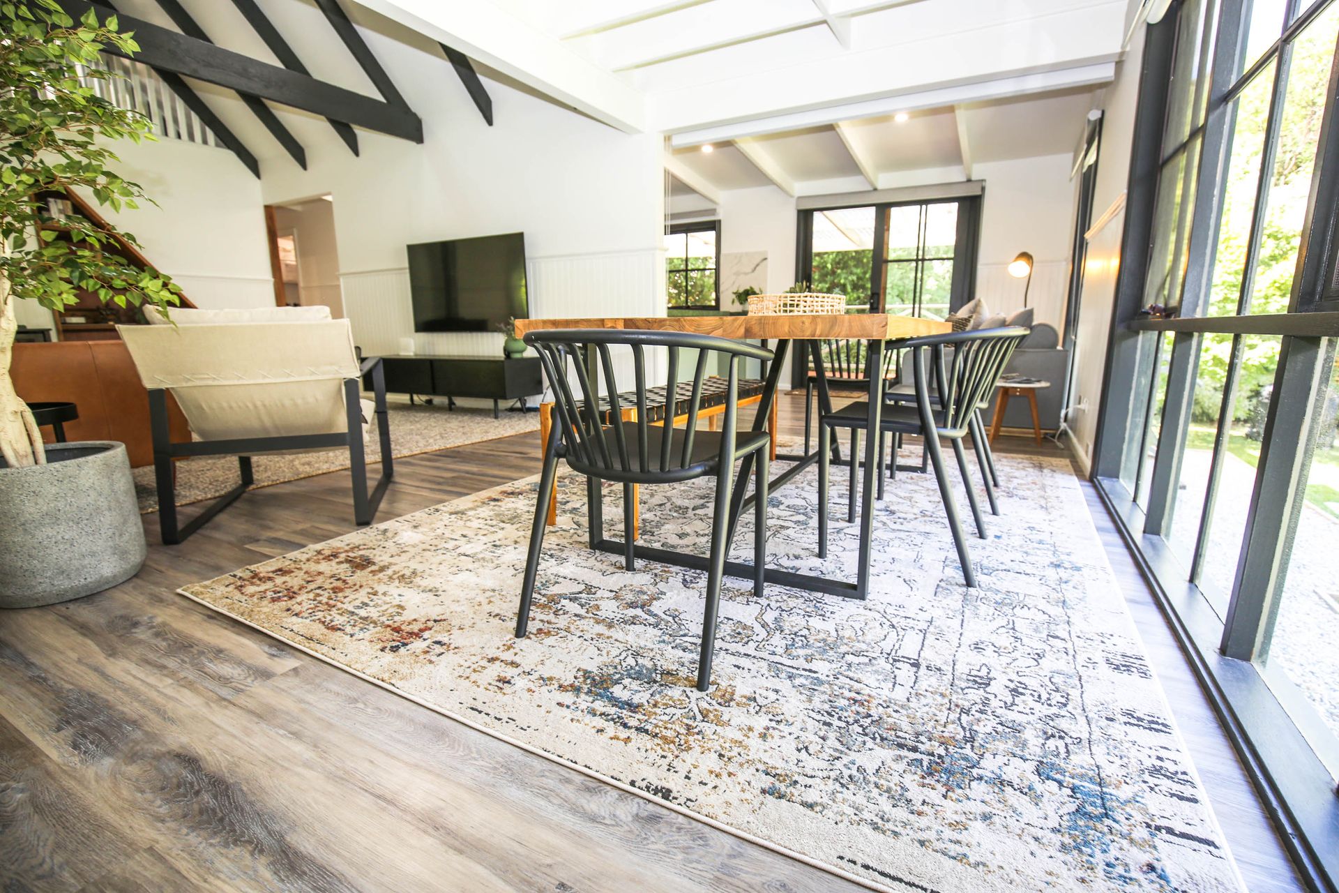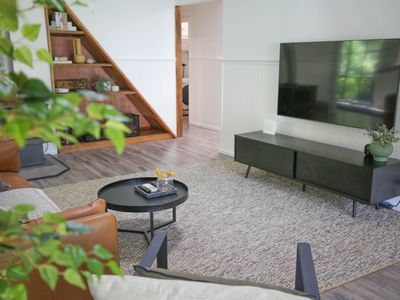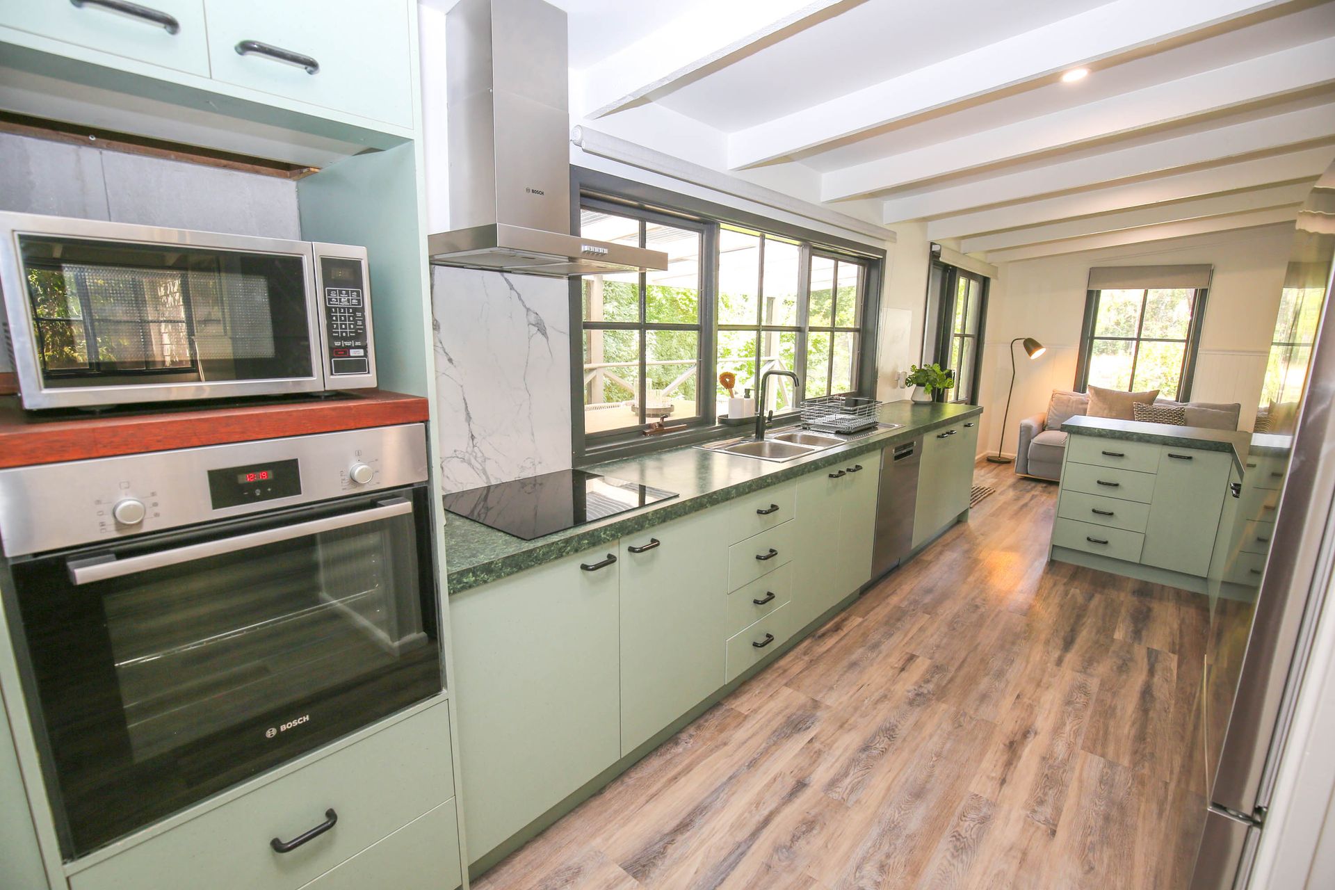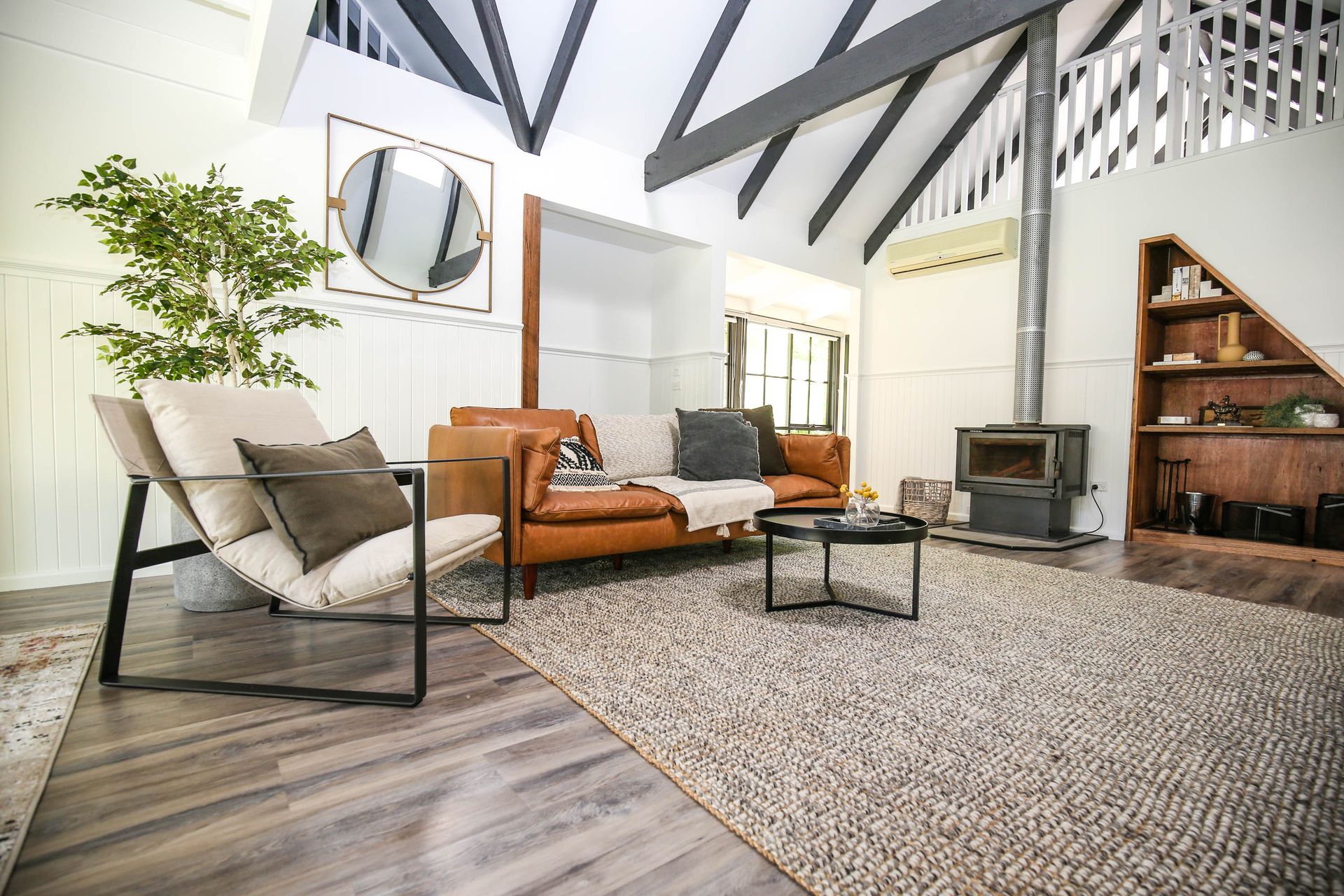 Inside, the home features a comfortable living area with a free standing woodfire, massive TV, plush seating, and a large dining table. The kitchen is fully equipped with everything you need to prepare meals during your stay, including a stove, oven, refrigerator, and microwave & lots of little extras.