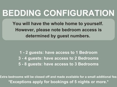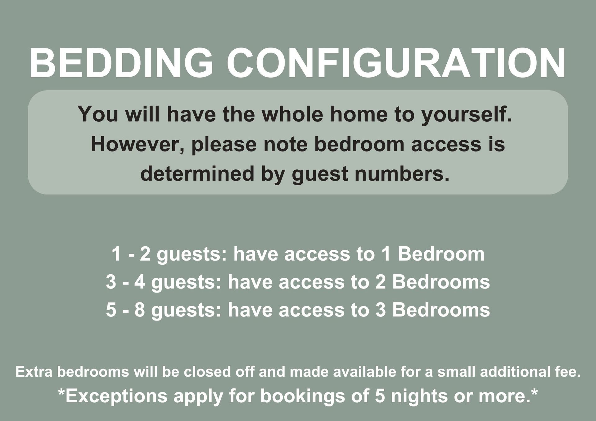 1-2 guests offers 1 bedroom, 3-4 guests offers 2 bedrooms, 5-8 guests offers 3 bedrooms. - Extra bedrooms available for a small additional fee – Exceptions apply for bookings of 5 nights or more.