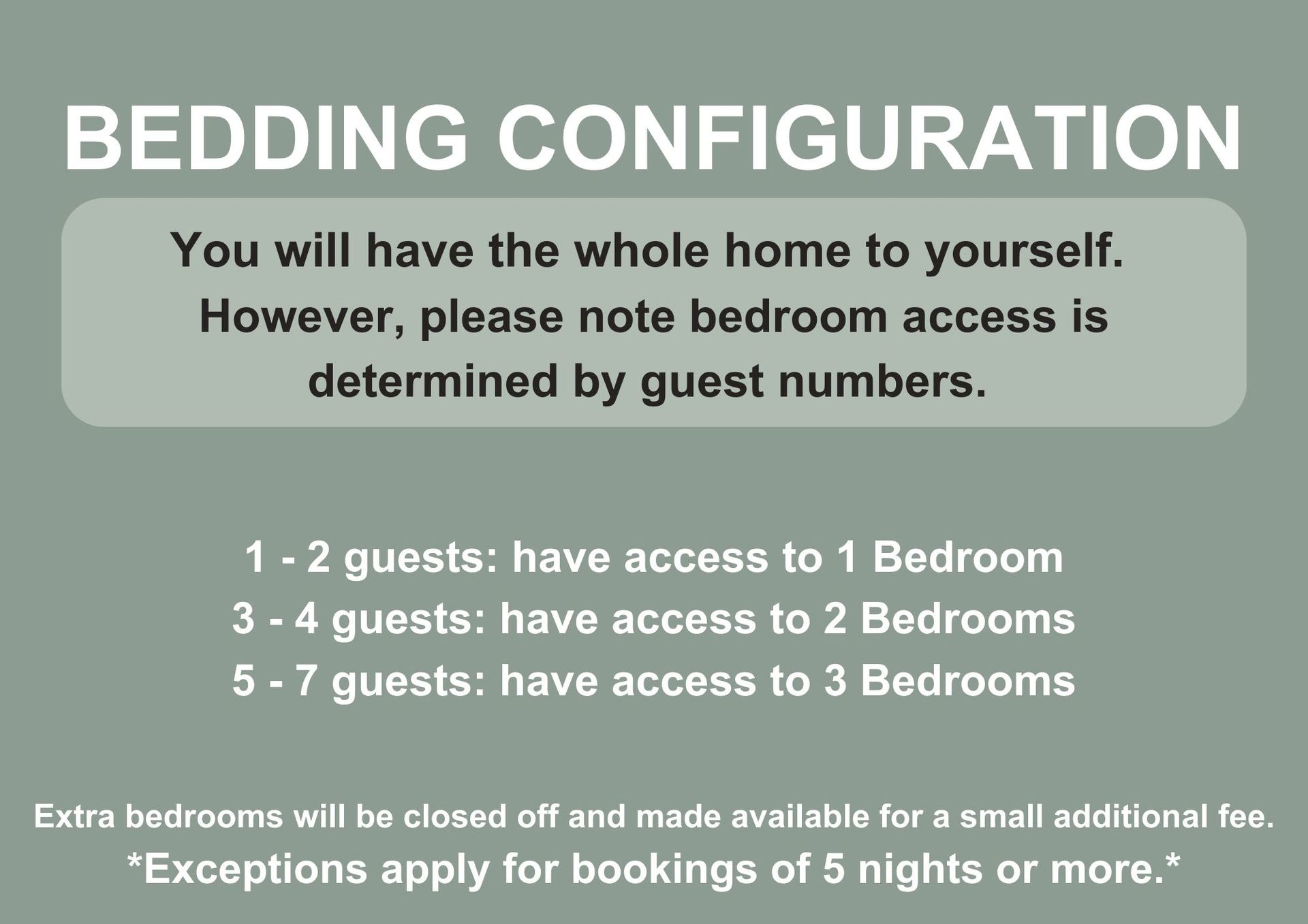 Extra bedrooms will be closed off and can only be made available for a a small additional fee. 1-2 guests offers 1 bedroom, 3-4 guests offers 2 bedrooms, 5-7 guests offers 3 bedrooms. Exceptions apply for bookings of 5 nights or more.