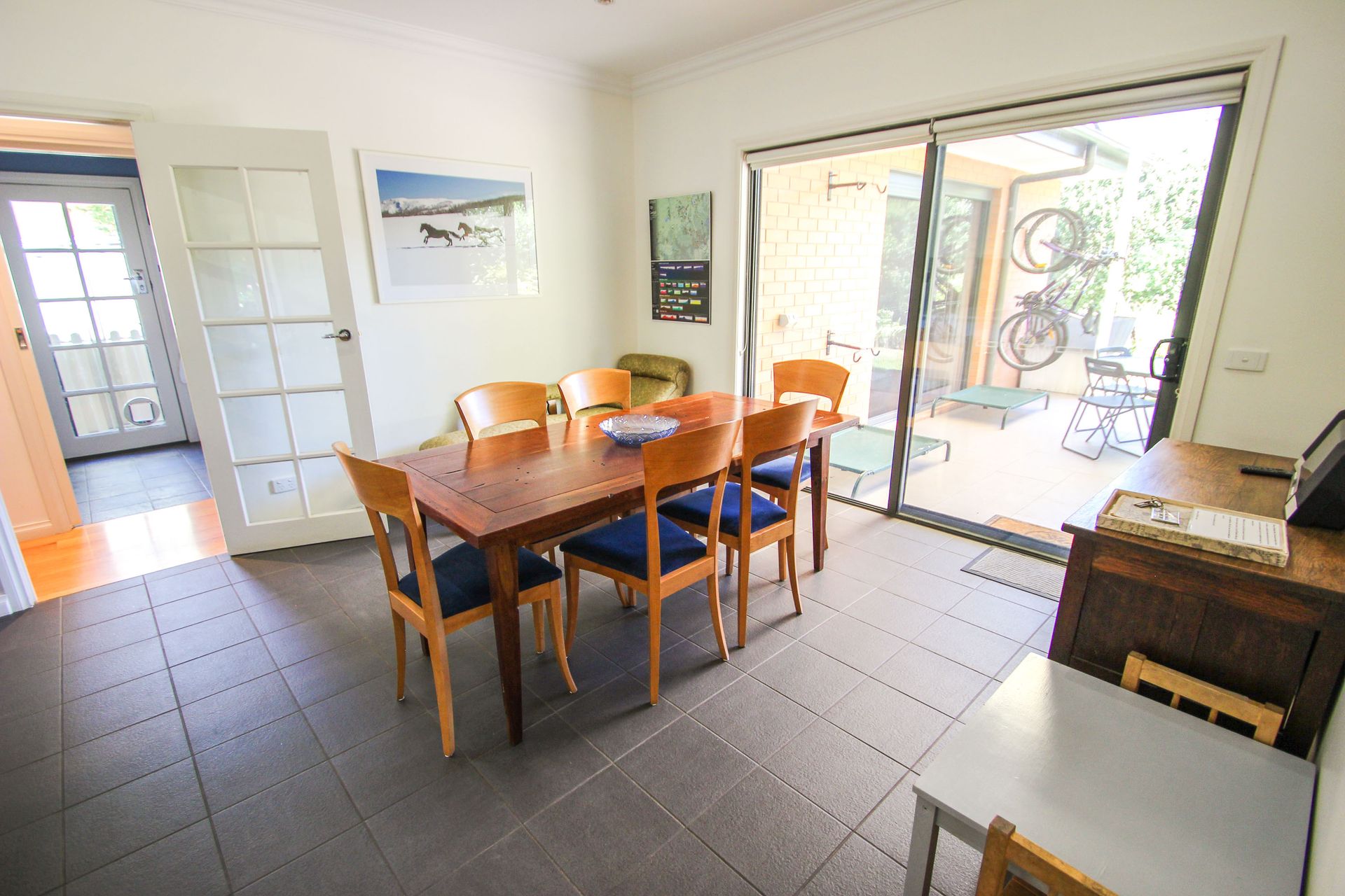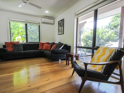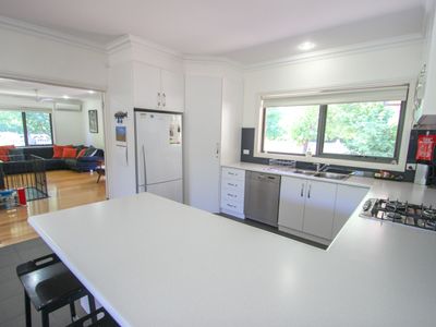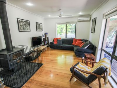 The open plan living, dining & kitchen leads out to your patio and 2 fully enclosed yards for safety & relaxation! Cook at home in your fully equipped kitchen or dine out just around the corner. Relax in the spacious lounge with wood fire & air con or catch up around the dining table. The property provides 2 mountain bikes for your use as well as a bike for the littlies - bring your helmets!