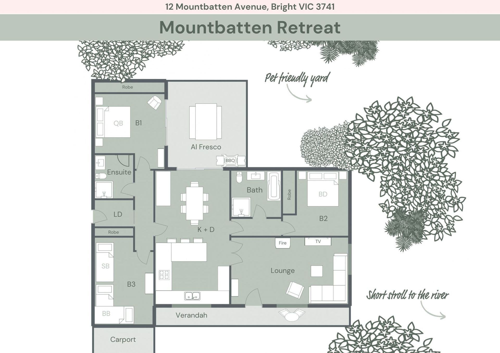 Mountbatten Retreat is a family & dog friendly home with all the comforts you could require. Situated a short stroll from Bright town centre, riverside parks and quality restaurants & cafes, you are in the perfect place to enjoy Bright.