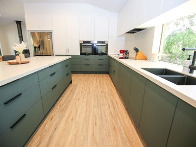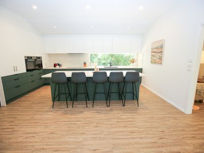 The roomy, fully equipped kitchen makes feeding the clan a breeze, or BBQ on the front deck with lovely views and open spaces.
