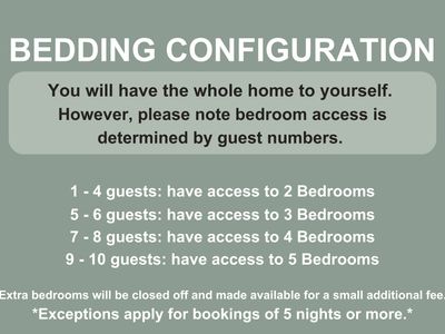 - Extra bedrooms will be closed off and can only be made available for a a small additional fee. * 1-4 guests offers 2 bedrooms, 5-6 guests offers 3 bedrooms, 7-8 guests offers 4 bedrooms, 9-10 guests offers 5 bedrooms. Exceptions apply for bookings of 5 nights or more.