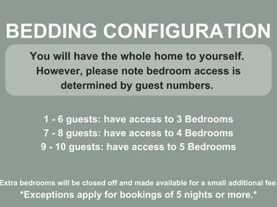 - Extra bedrooms will be closed off and can only be made available for a a small additional fee. * 1-6 guests offers 3 bedrooms, 7-8 guests offers 4 bedrooms, 9-10 guests offers all bedrooms. Exceptions apply for bookings of 5 nights or more.