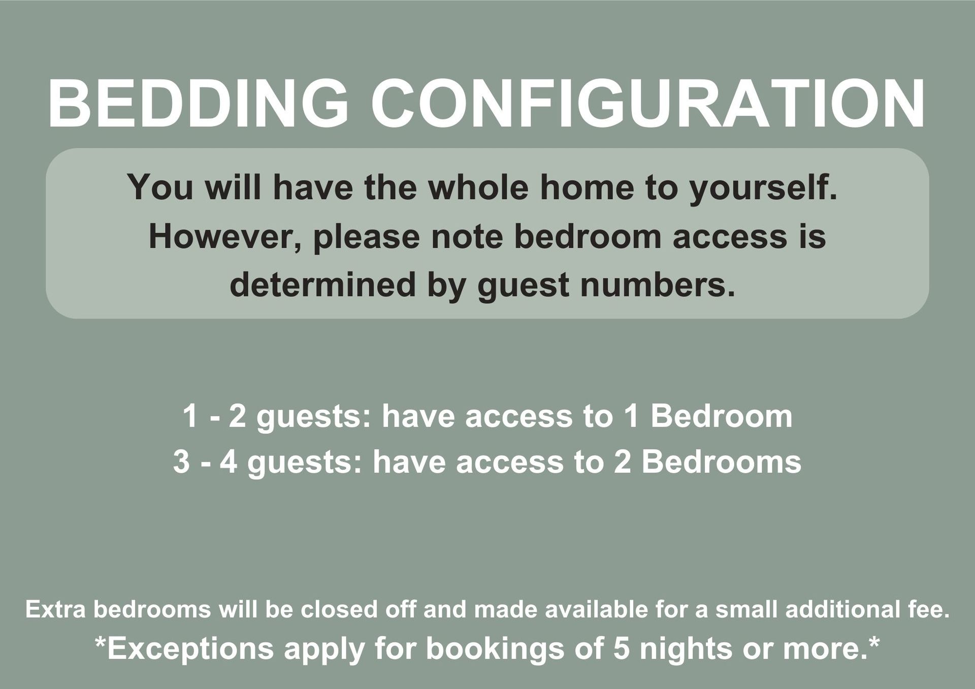 - Extra bedrooms will be closed off and can only be made available for a a small additional fee. * 1-2 guests offers 1 bedroom, 3-4 guests offers 2 bedrooms. Exceptions apply for bookings of 5 nights or more.