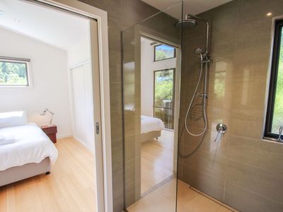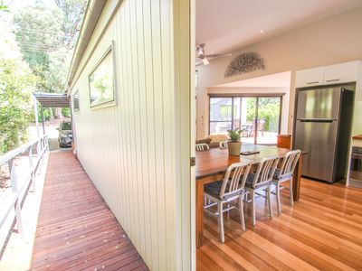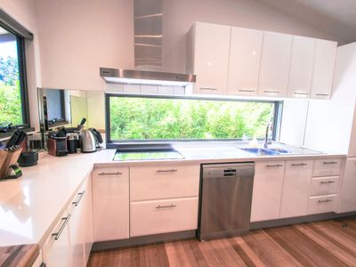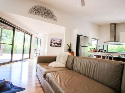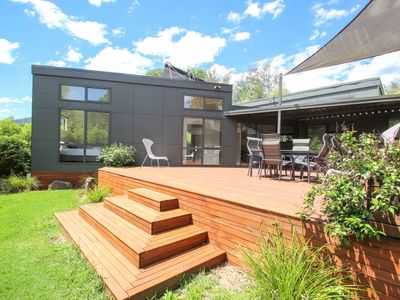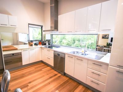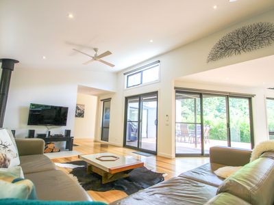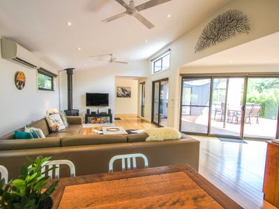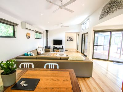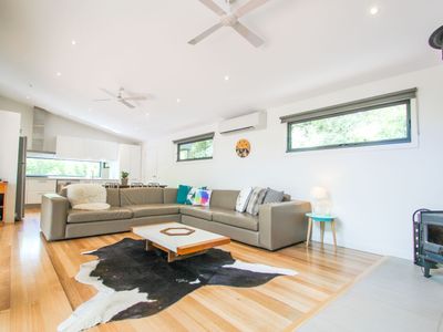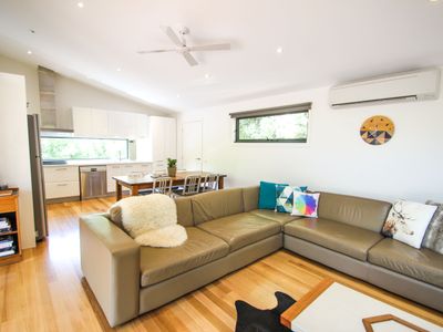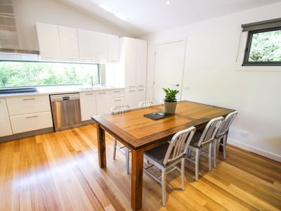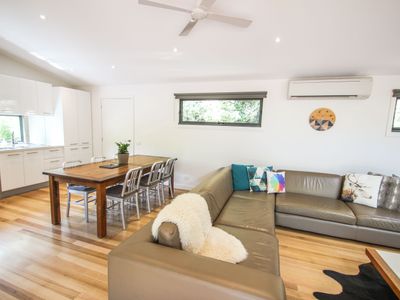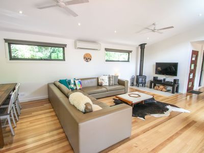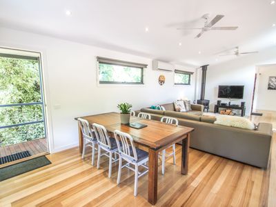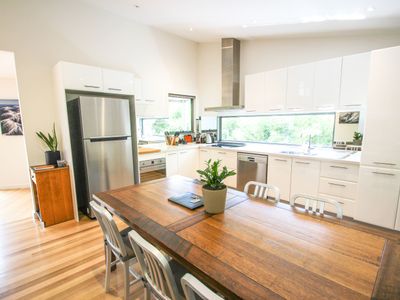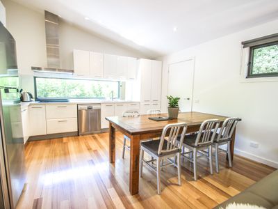 The open plan living area features a wood fire and Smart TV as well as reverse cycle heating/cooling. Open out onto the huge deck with outdoor setting or cook up a storm in your fully equipped kitchen with quality Smeg appliances - or start the day with a Nespresso before a short stroll to a delicious cafe breakfast.