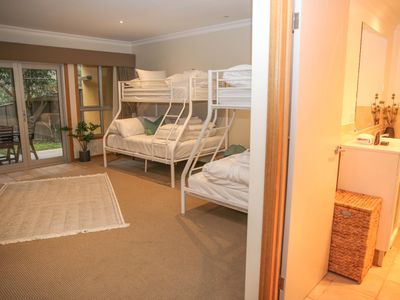 A separate downstairs level creates a perfect rumpus room for the kids or separate space for another couple and is complete with its own generously sized bathroom, 2 sets of bunks, a couch and tv. It also has access to the rear yard leading directly out to the pine plantations and river access to town. The master bedroom is on the entry level and offers a king bed and its own full-sized bathroom