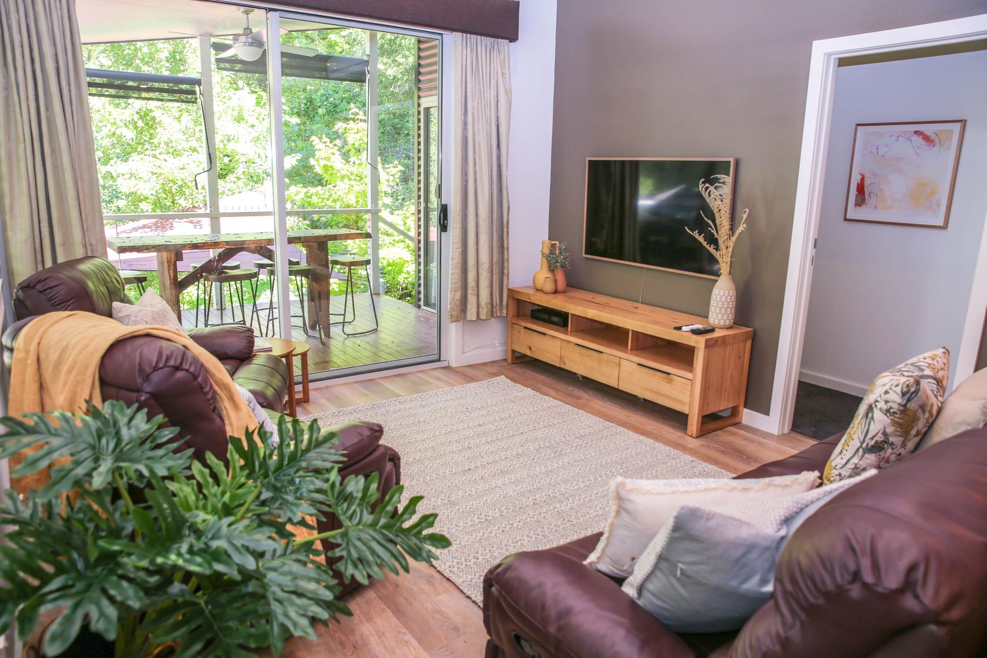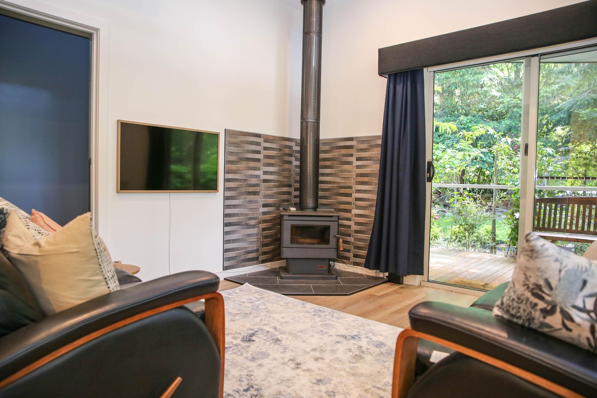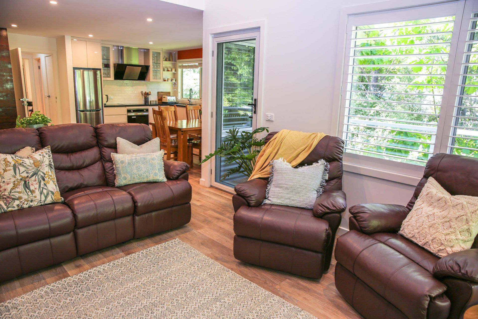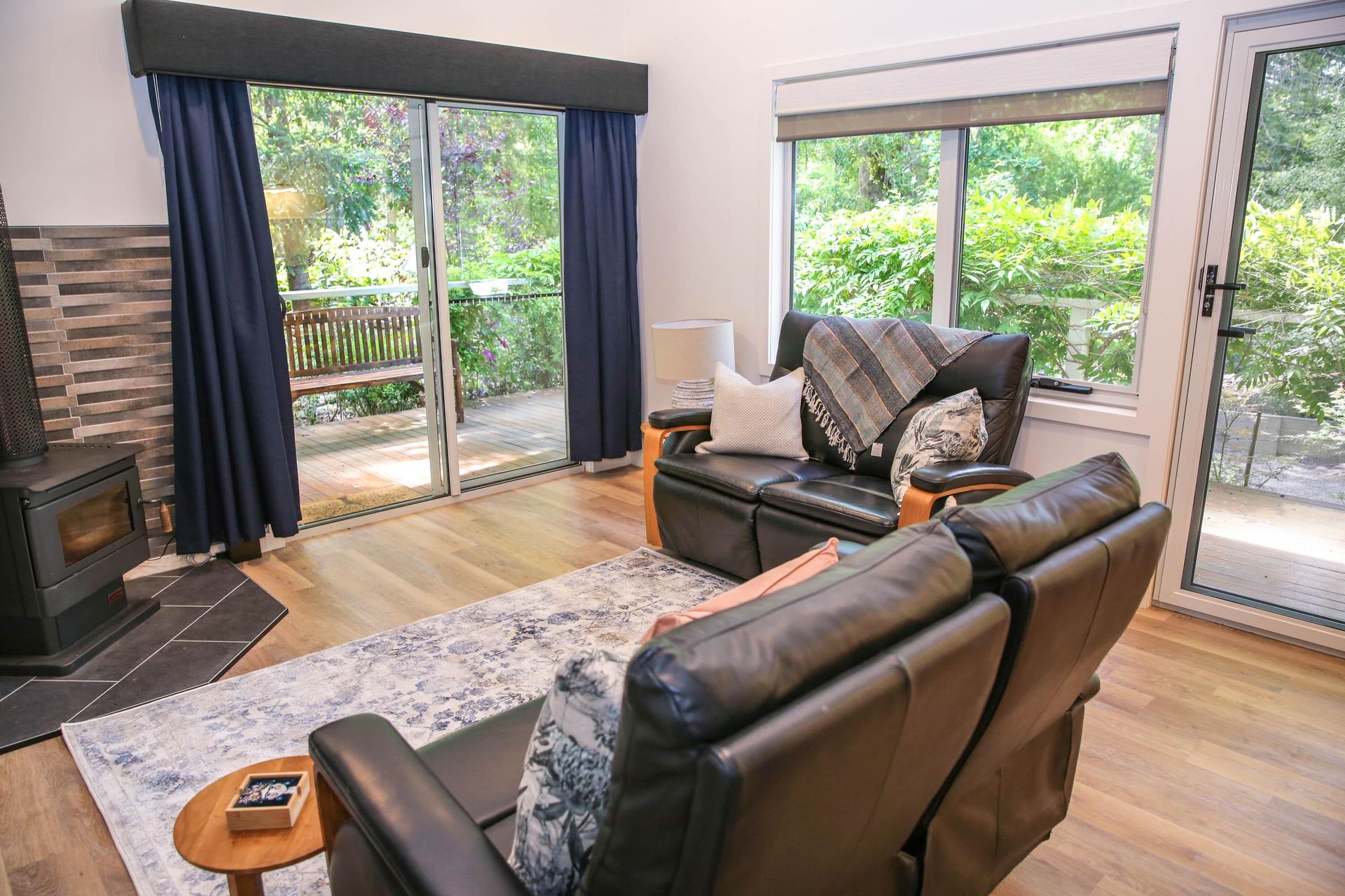The Poached Pear is 4-bedroom, 3-bathroom home with a space for everyone in the family or group to claim their own private nook. It may be the spacious outdoor garden, elevated deck with private areas on either side of the house, either of the 2 living spaces, 2 dining areas, by either of the 2 wood fires or the serenity of the relaxation room. Need I say more.