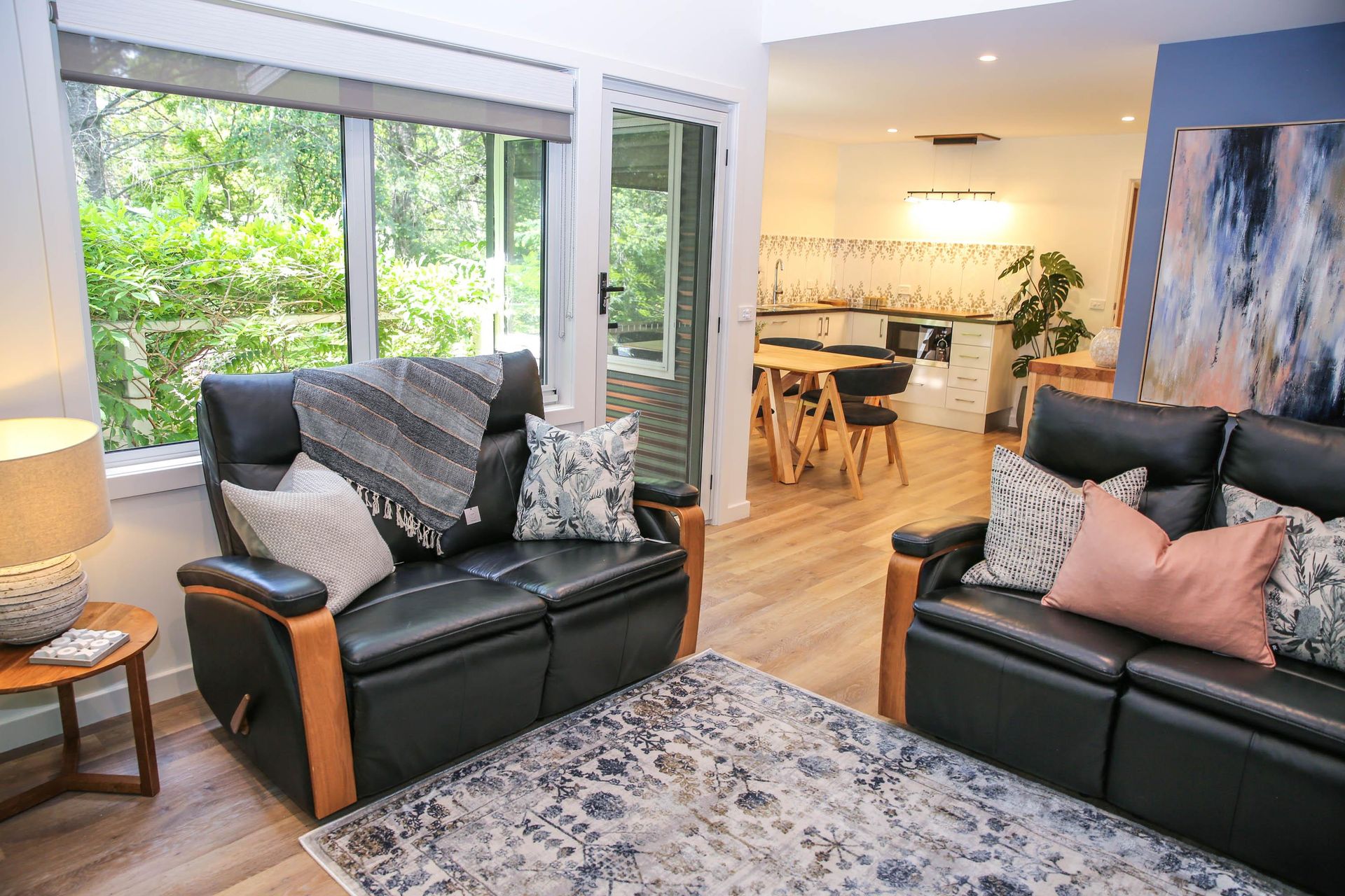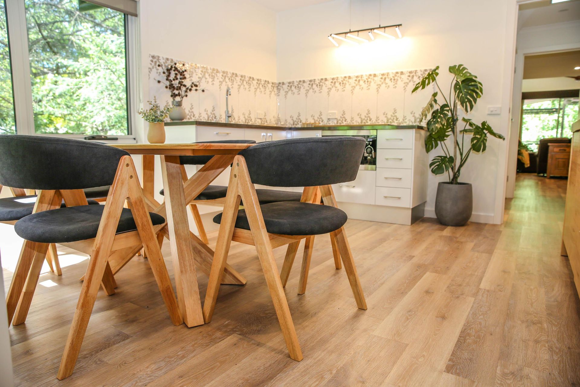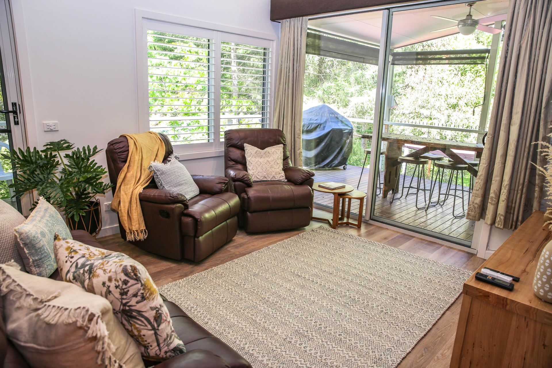 The Poached Pear is 4-bedroom, 3-bathroom home with a space for everyone in the family or group to claim their own private nook. It may be the spacious outdoor garden, elevated deck with private areas on either side of the house, either of the 2 living spaces, 2 dining areas, by either of the 2 wood fires or the serenity of the relaxation room. Need I say more.