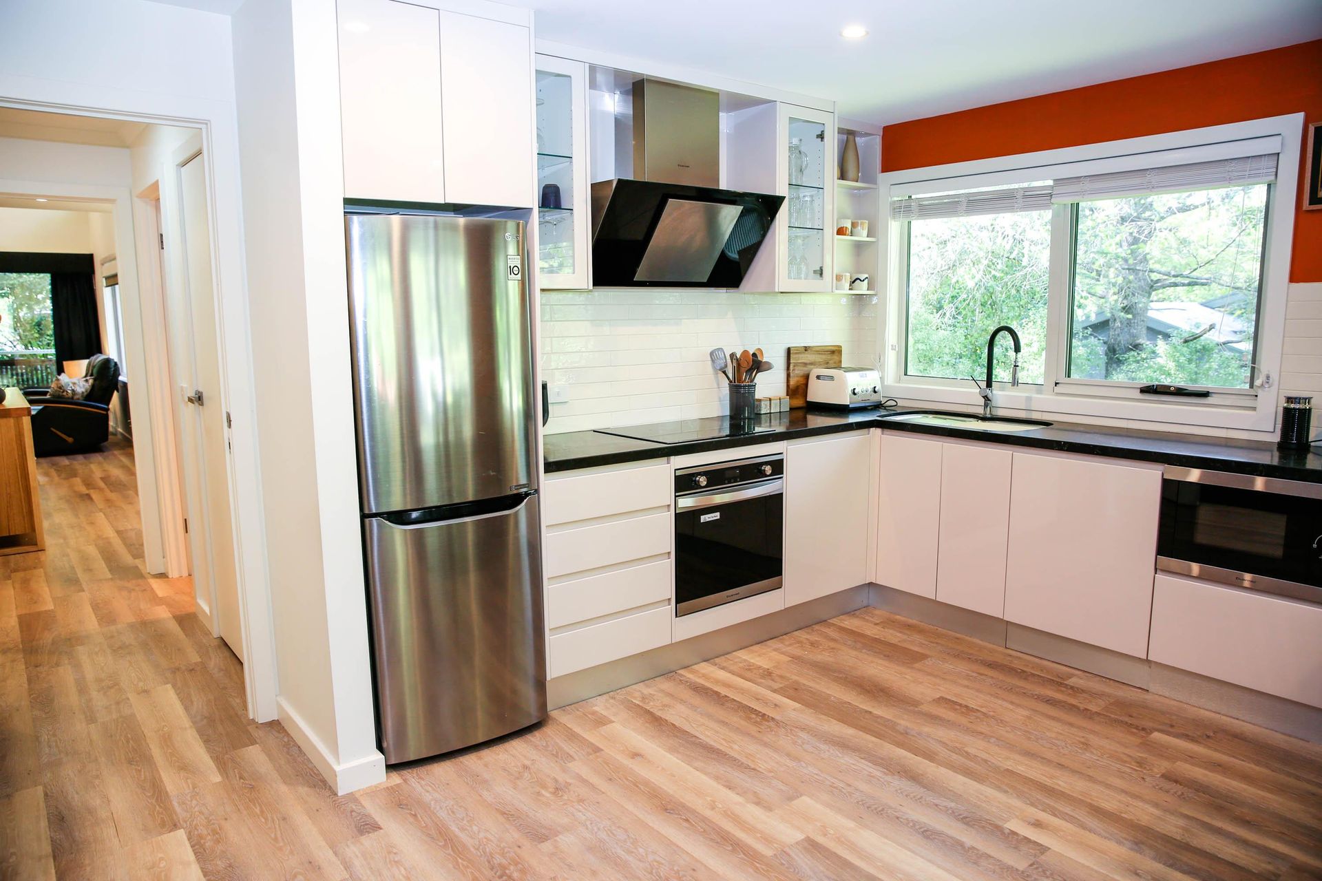 The living areas are both fitted with their own TV, wood fires & reverse cycle and both comfortably seat 4 to 6 people. The home also has a fully equipped European laundry for those longer stays or to refresh your gear after harsh winter days up in the ski fields or out on the mountain bike track. There's also a second washing machine fitted outdoors for any overflow.
