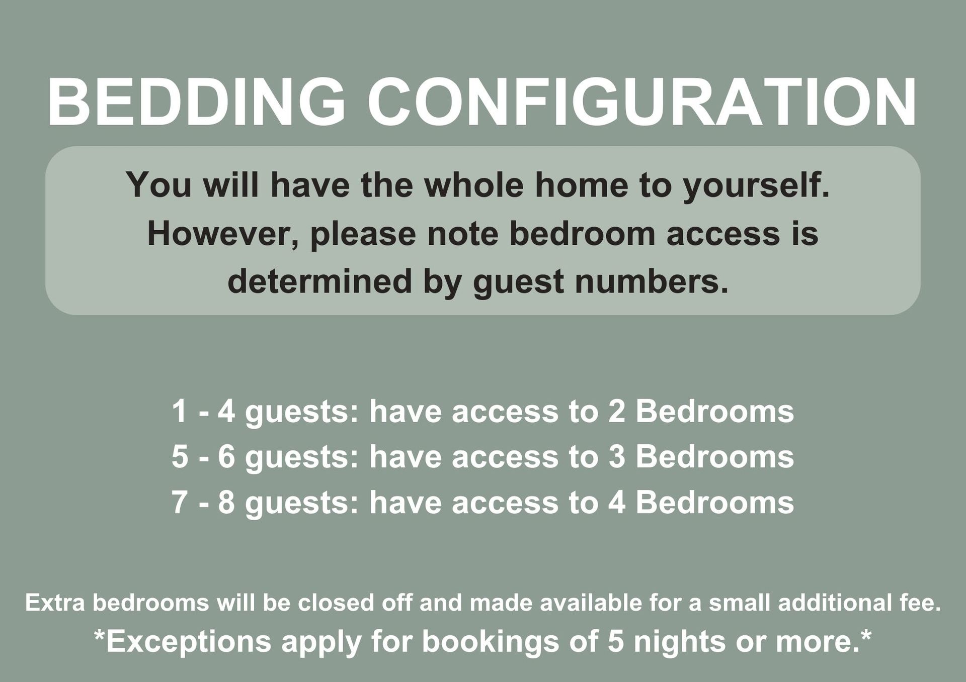 - Extra bedrooms will be closed off and can only be made available for a a small additional fee. * 1-4 guests offers 2 bedrooms, 5-6 guests offers 3 bedrooms, 7-8 guests offers 4 bedrooms. Exceptions apply for bookings of 5 nights or more.