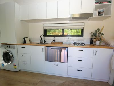 - Modern, well equipped kitchenette with gas cooktop + dishwasher