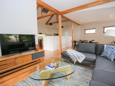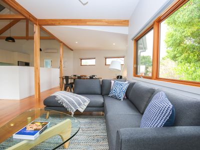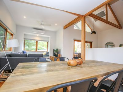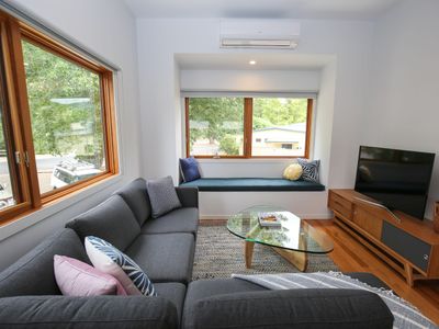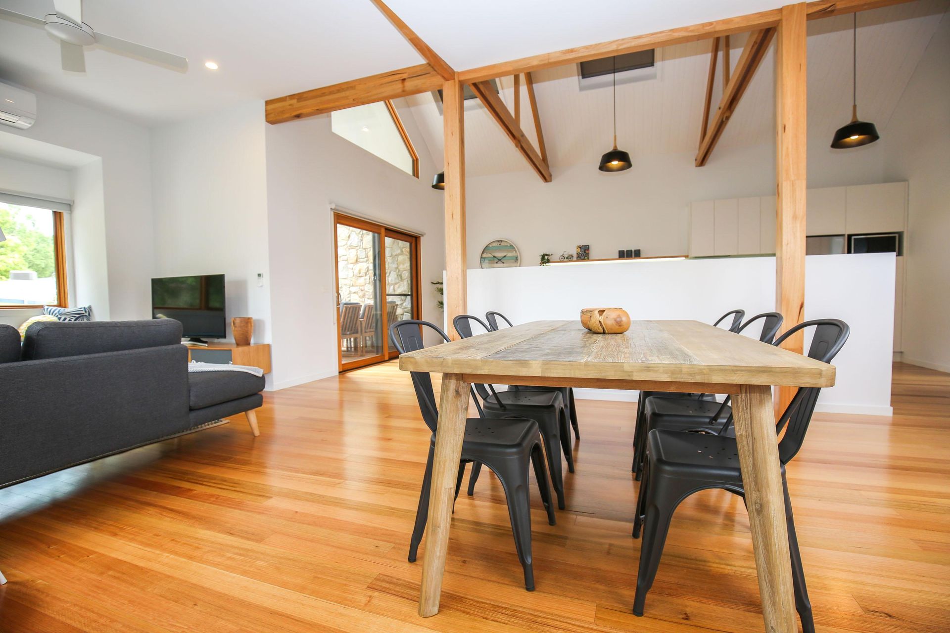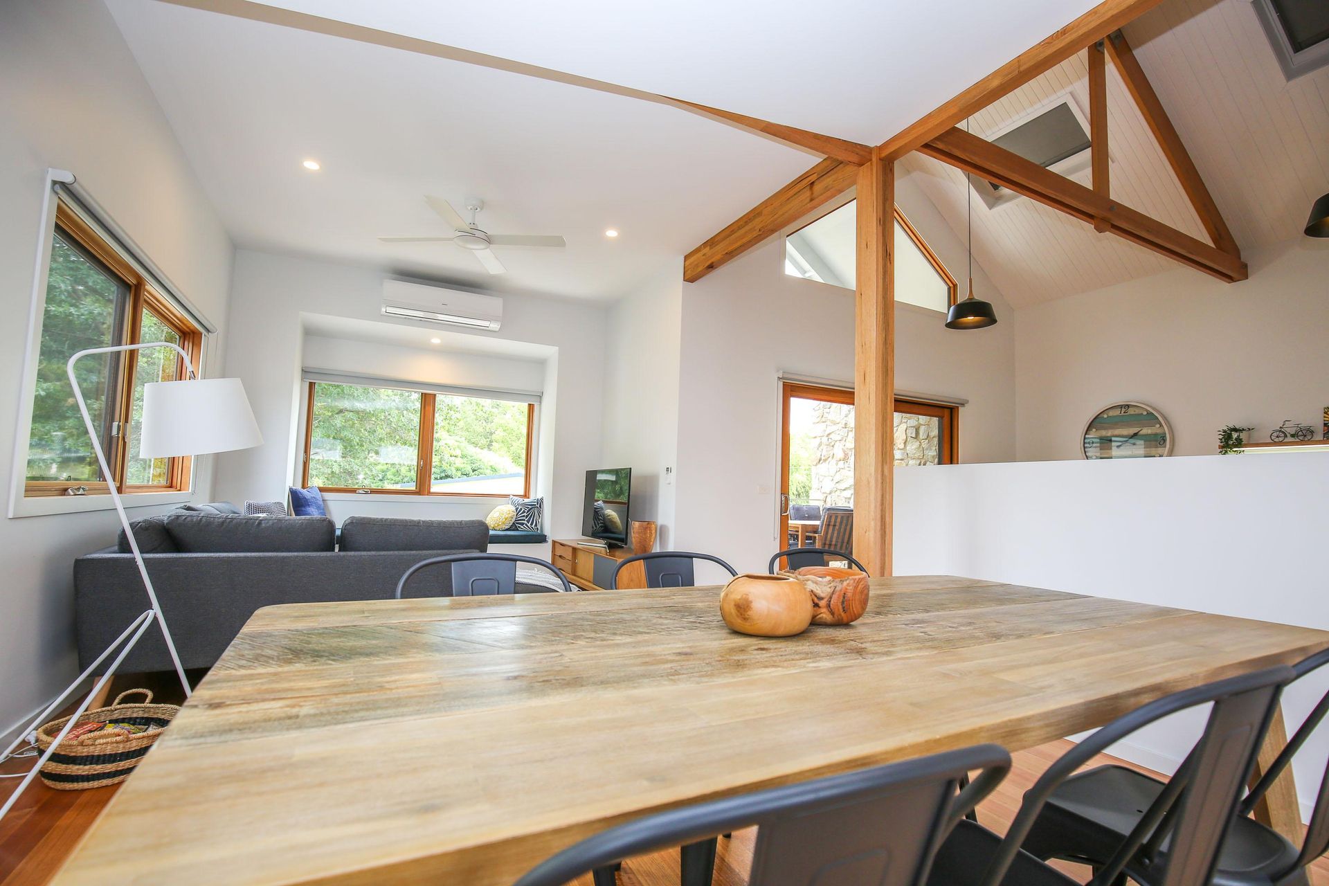 Relax in the sunny open plan living area with gorgeous views of the surrounding mountains and sun streaming through perfectly positioned windows and skylights. The vaulted ceilings with stunning exposed beams create a spacious zone to unwind & reconnect. The gorgeous window seat is the perfect place to leave it all behind.