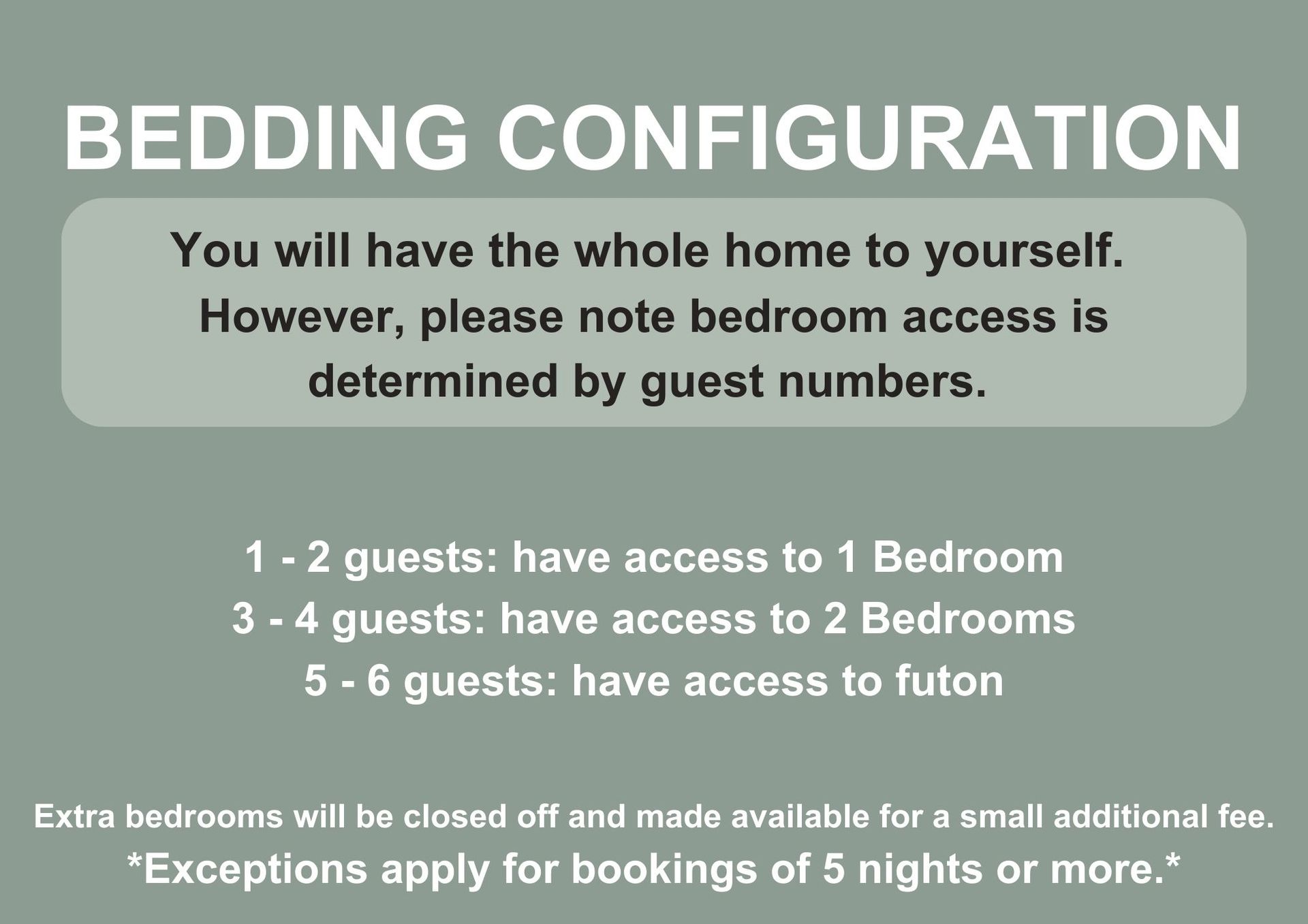 - Extra bedrooms will be closed off and can only be made available for a a small additional fee. * 1-2 guests offers 1 bedroom, 3-4 guests offers 2 bedrooms, 5-6 guests offers use of futon. Exceptions apply for bookings of 5 nights or more.