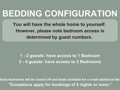- Extra bedrooms will be closed off and can only be made available for a a small additional fee. * 1-2 guests offers 1 bedroom, 3-4 guests offers 2 bedrooms. Exceptions apply for bookings of 5 nights or more.