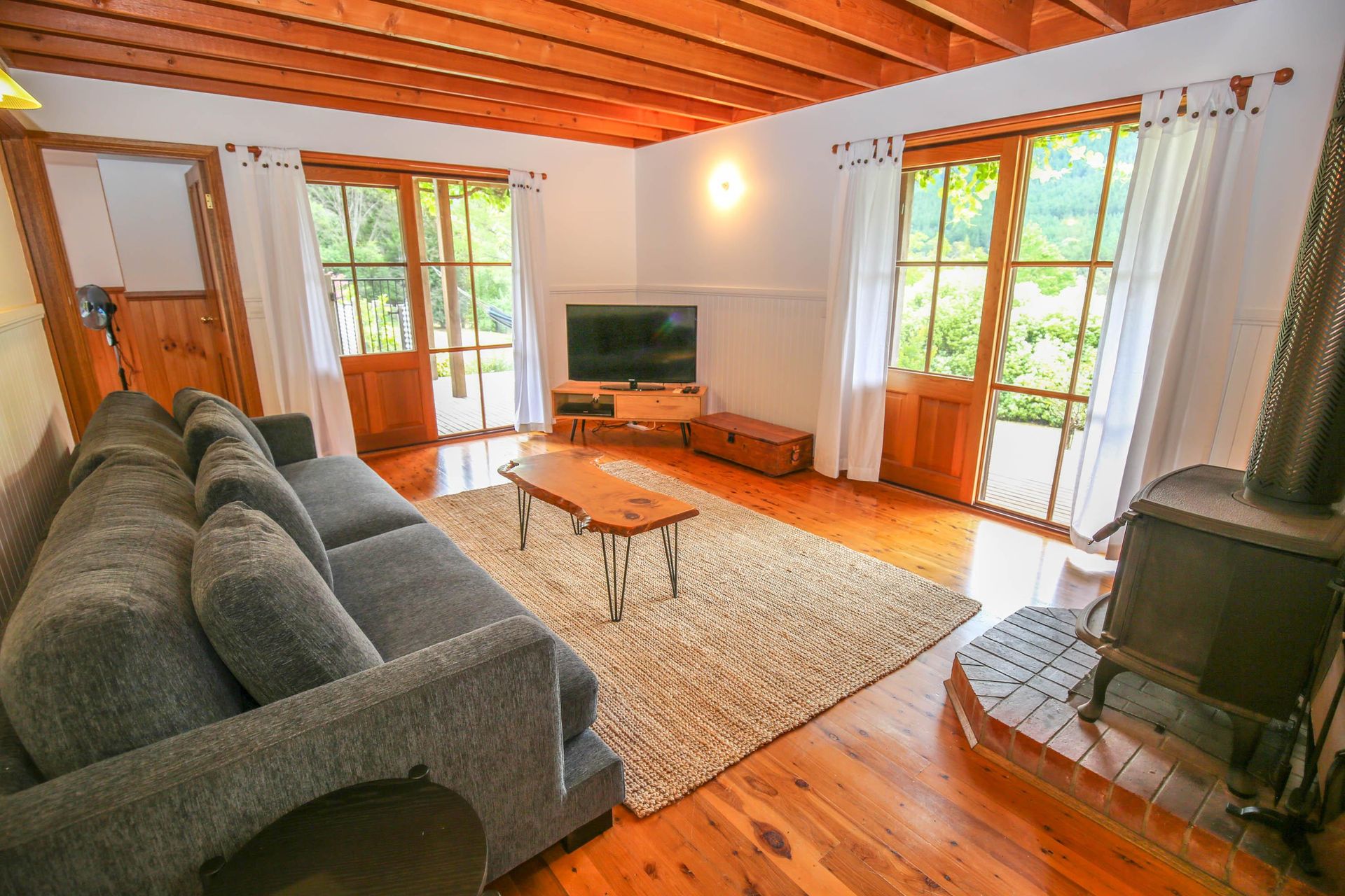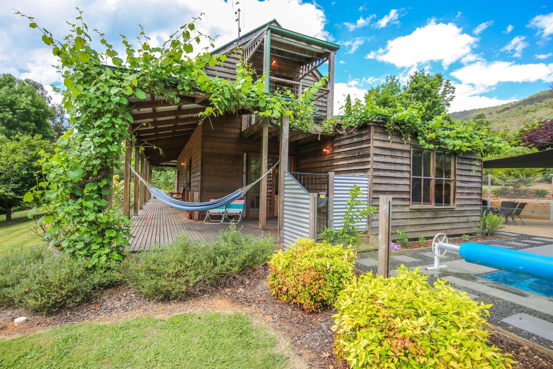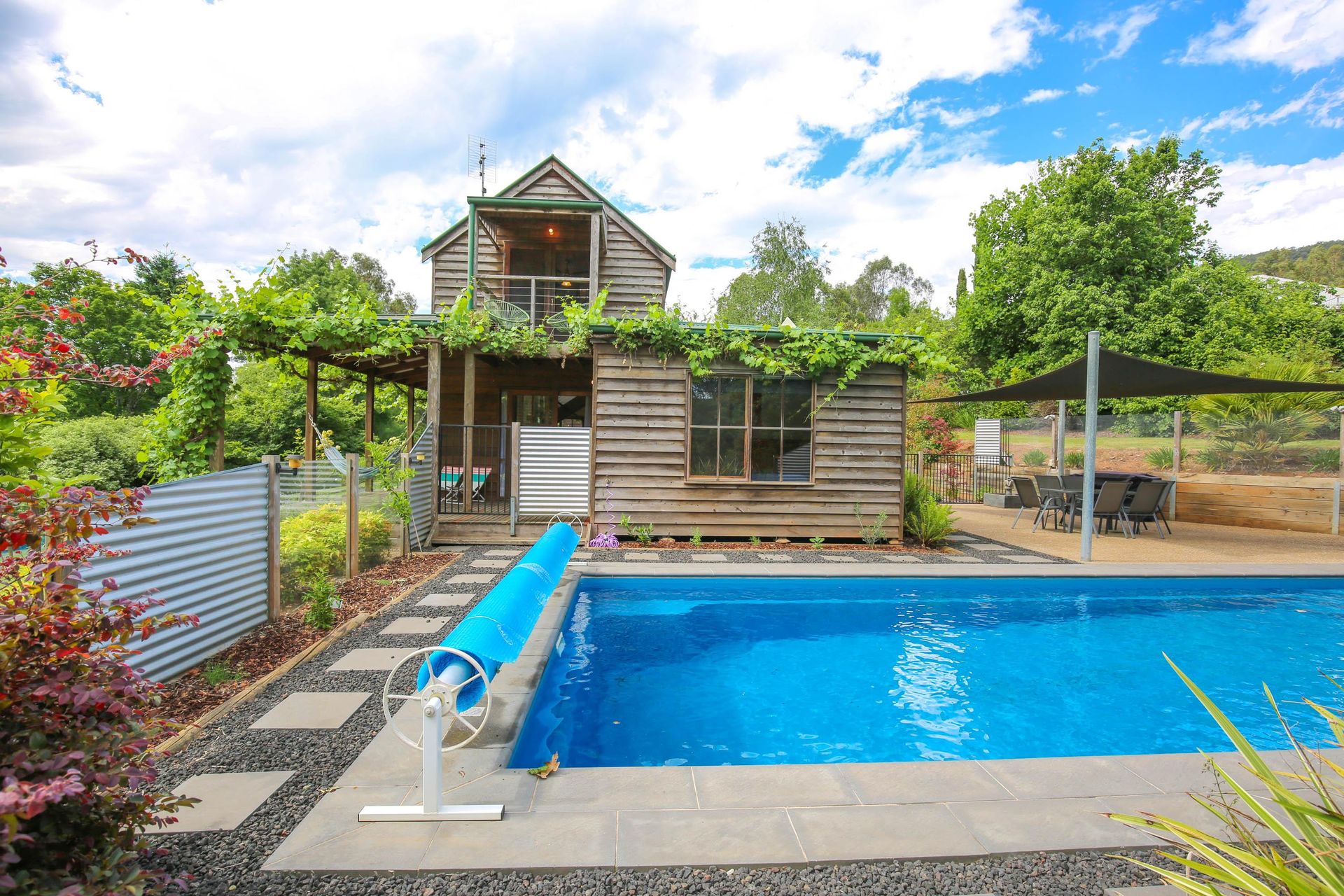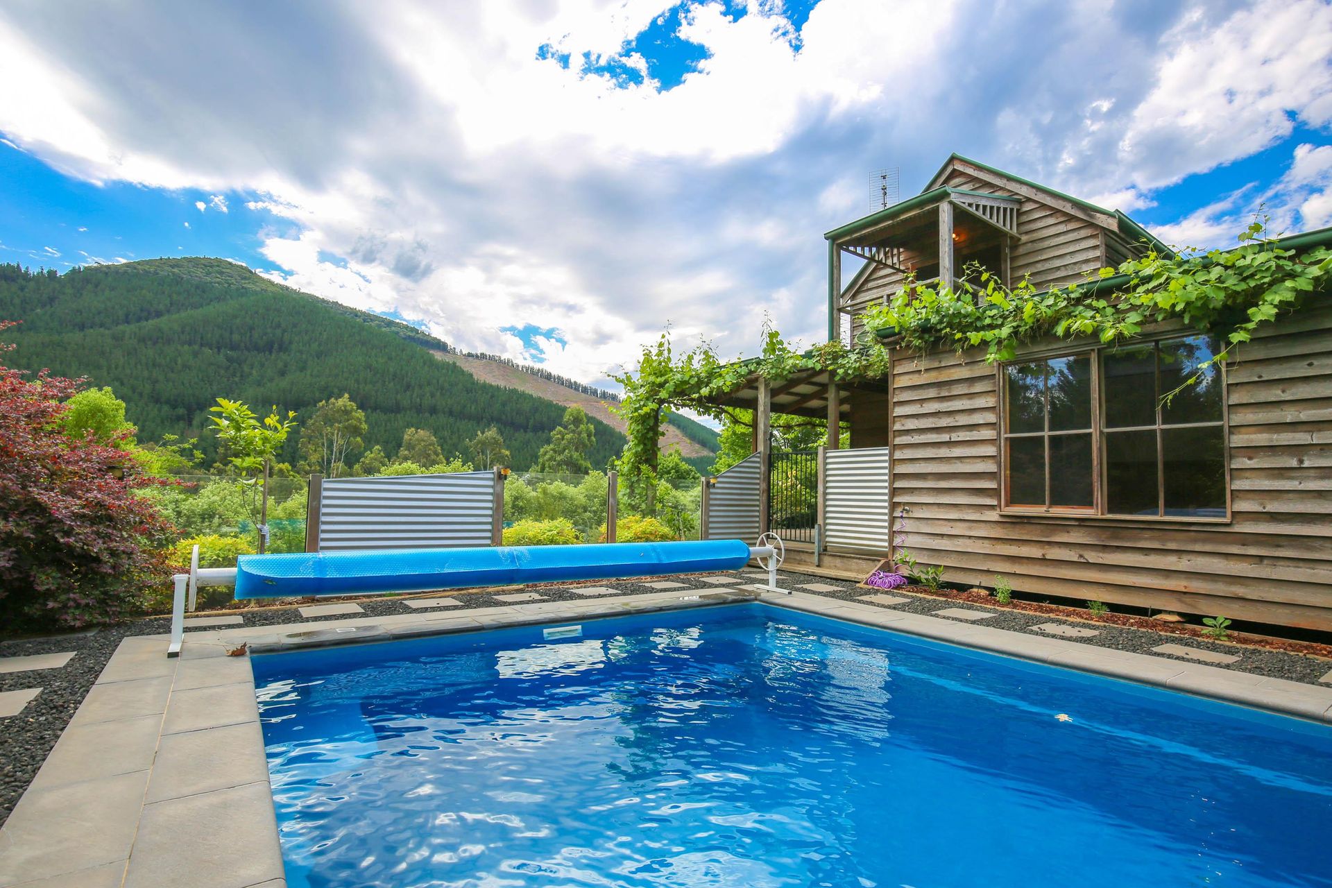 3 comfortable bedrooms, 2 with queen beds and 1 with 2 singles, the master bedroom in the upstairs loft has its own bathroom and French doors opening out onto a small balcony that looks straight out over the garden, pool and across the valley. The main downstairs bathroom features a shower over a quaint claw foot bath making this property ideal for 2 couples or a small family.