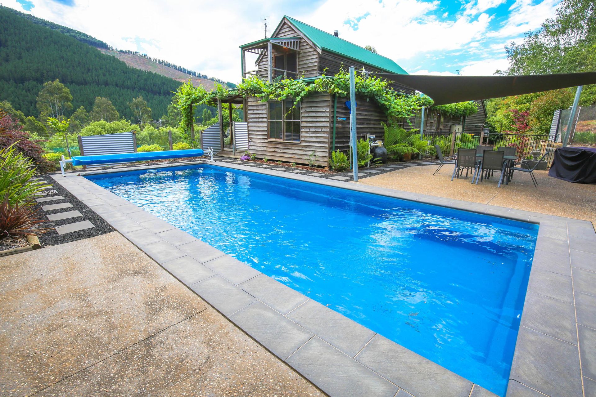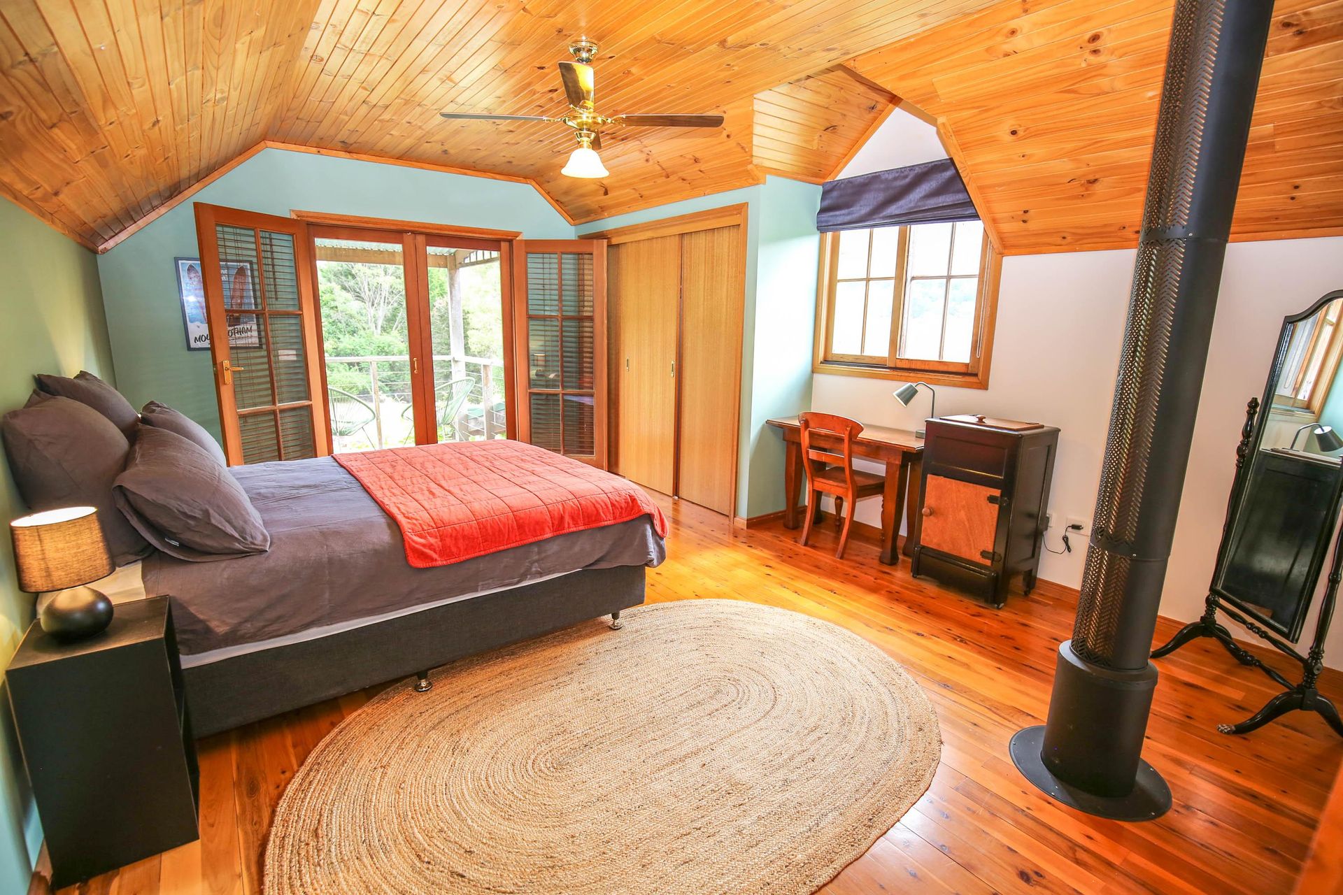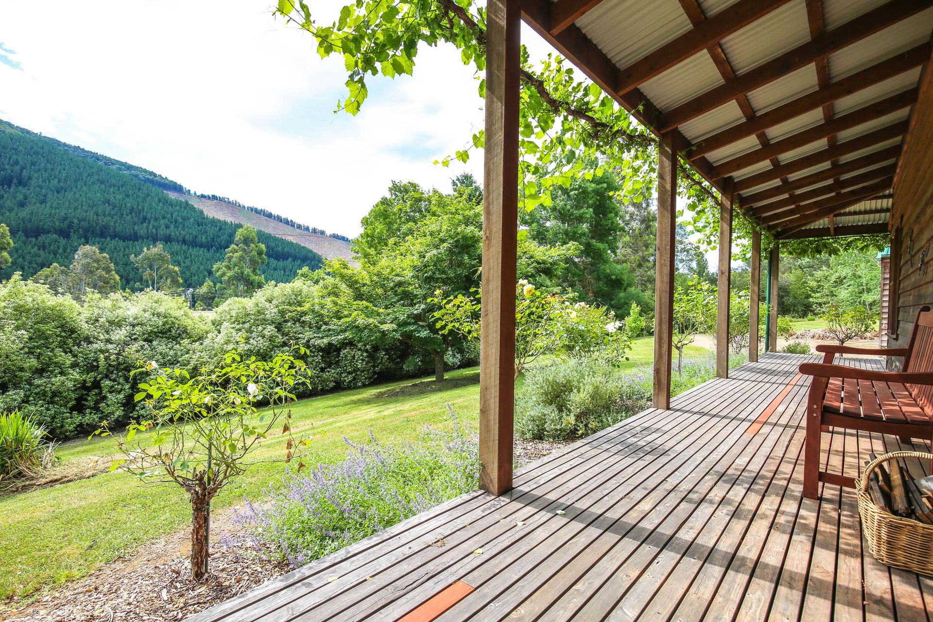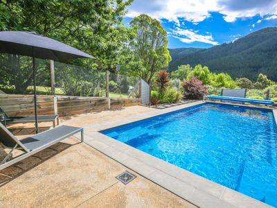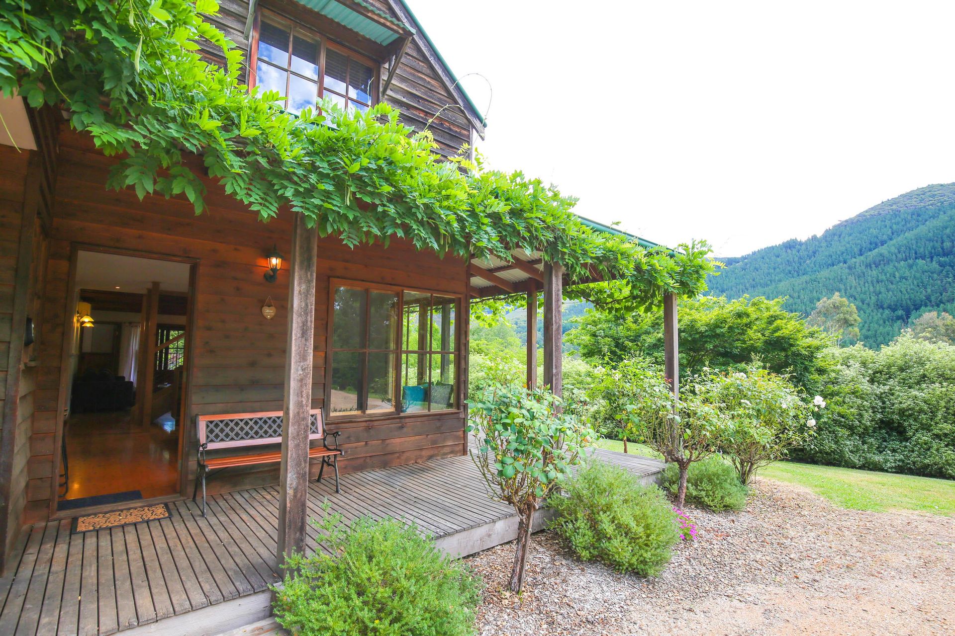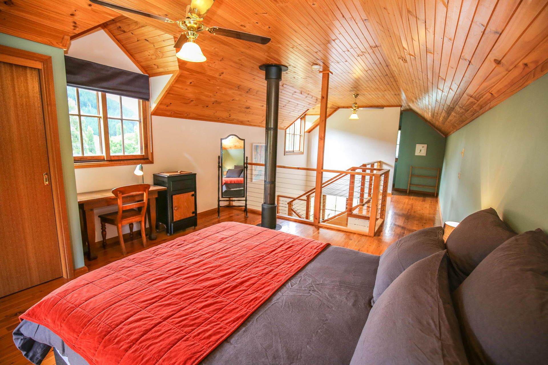 3 comfortable bedrooms, 2 with queen beds and 1 with 2 singles, the master bedroom in the upstairs loft has its own bathroom and French doors opening out onto a small balcony that looks straight out over the garden, pool and across the valley. The main downstairs bathroom features a shower over a quaint claw foot bath making this property ideal for 2 couples or a small family.