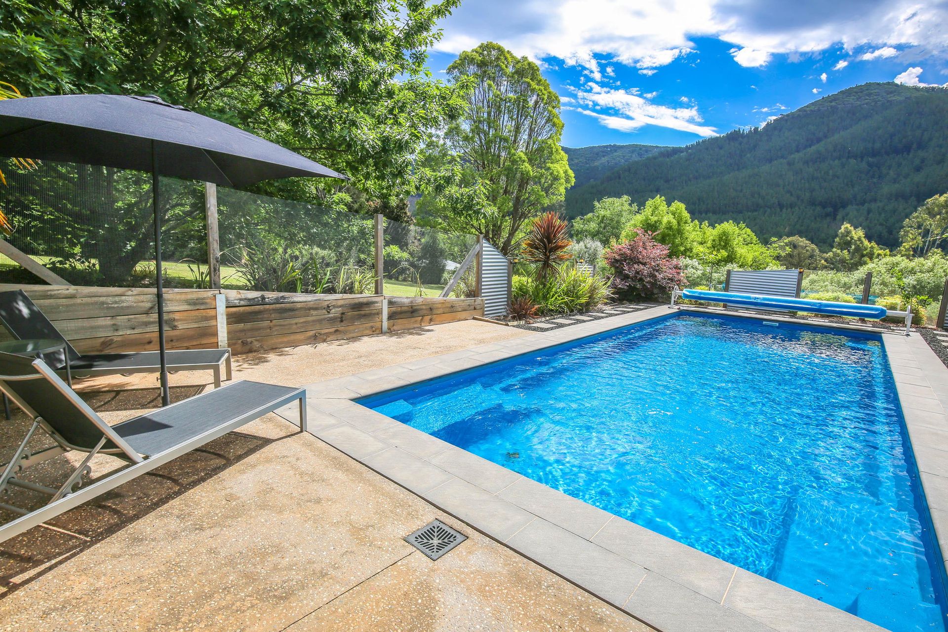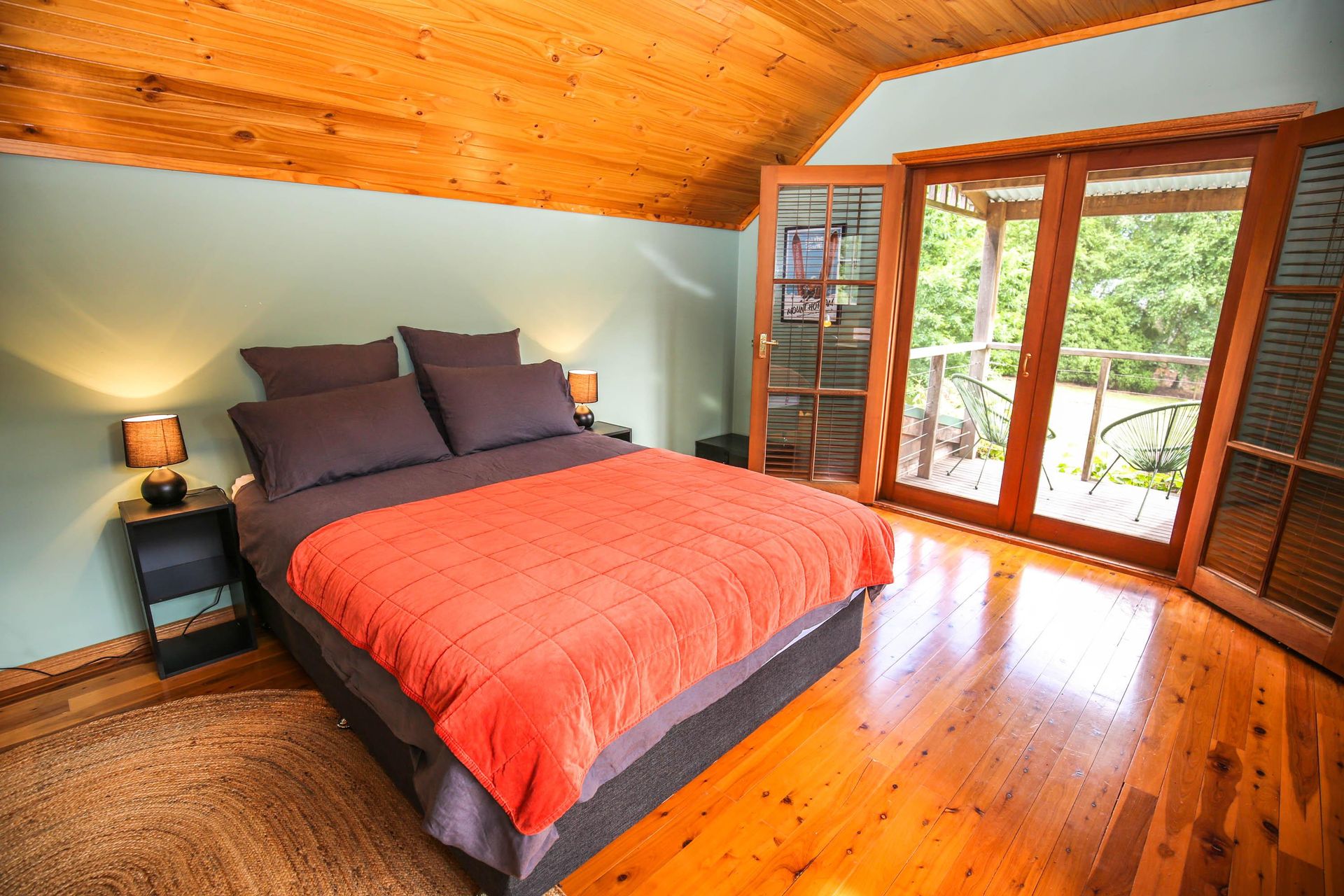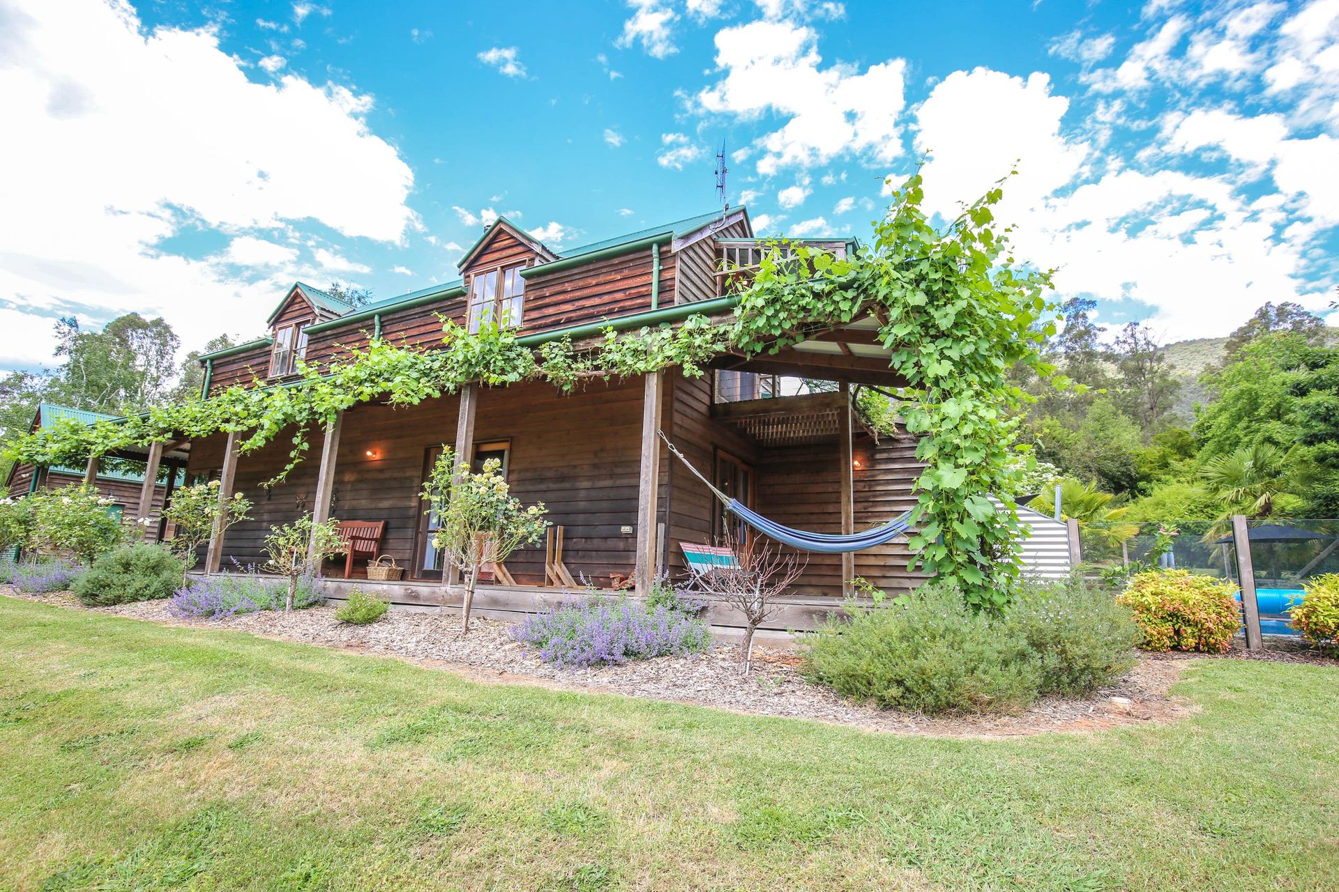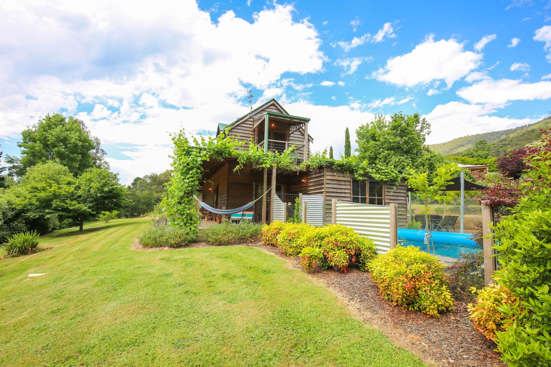 3 comfortable bedrooms, 2 with queen beds and 1 with 2 singles, the master bedroom in the upstairs loft has its own bathroom and French doors opening out onto a small balcony that looks straight out over the garden, pool and across the valley. The main downstairs bathroom features a shower over a quaint claw foot bath making this property ideal for 2 couples or a small family.
