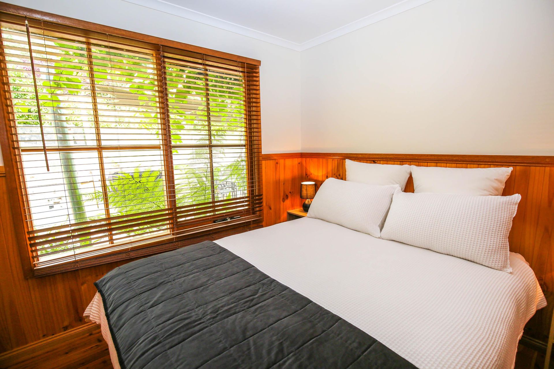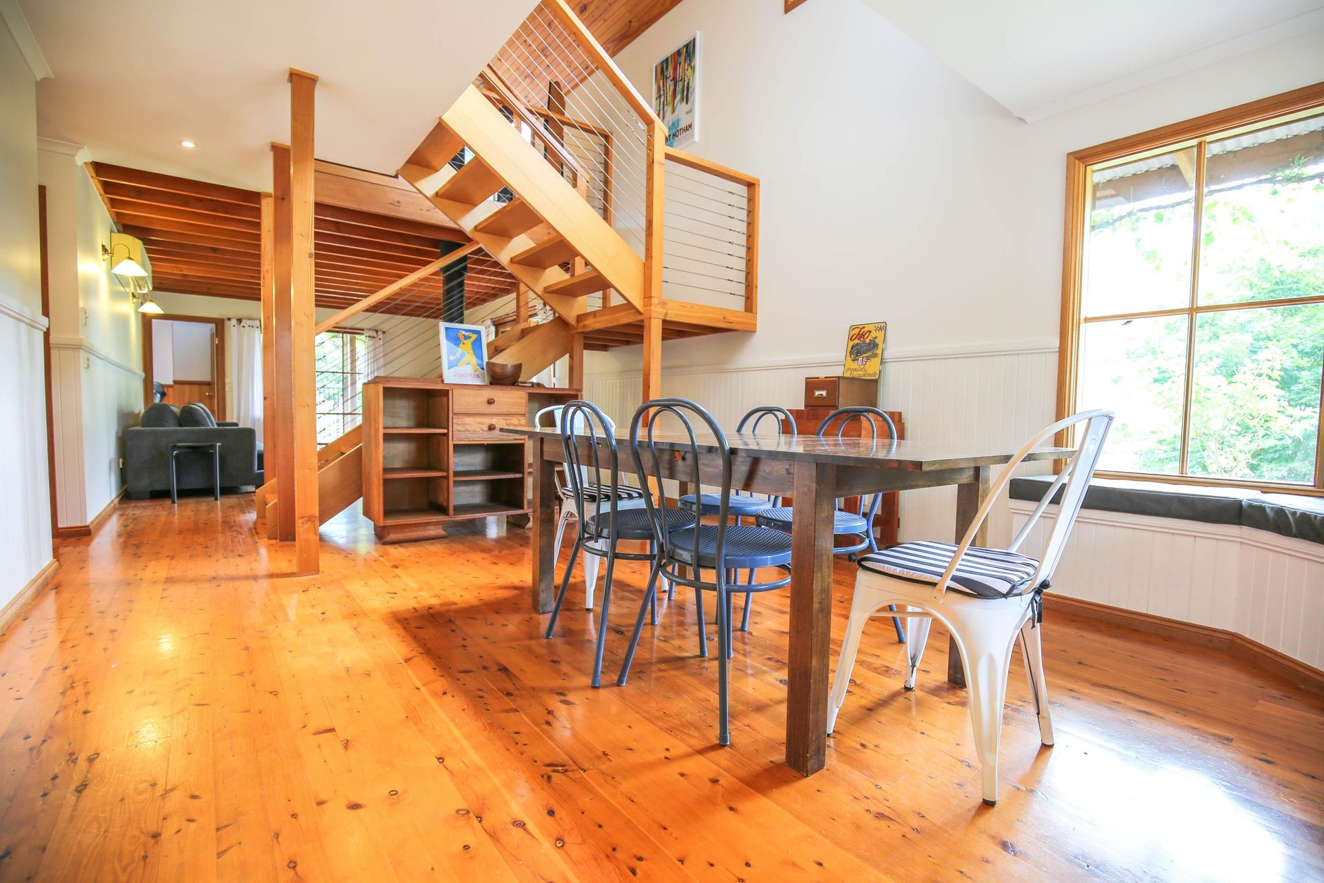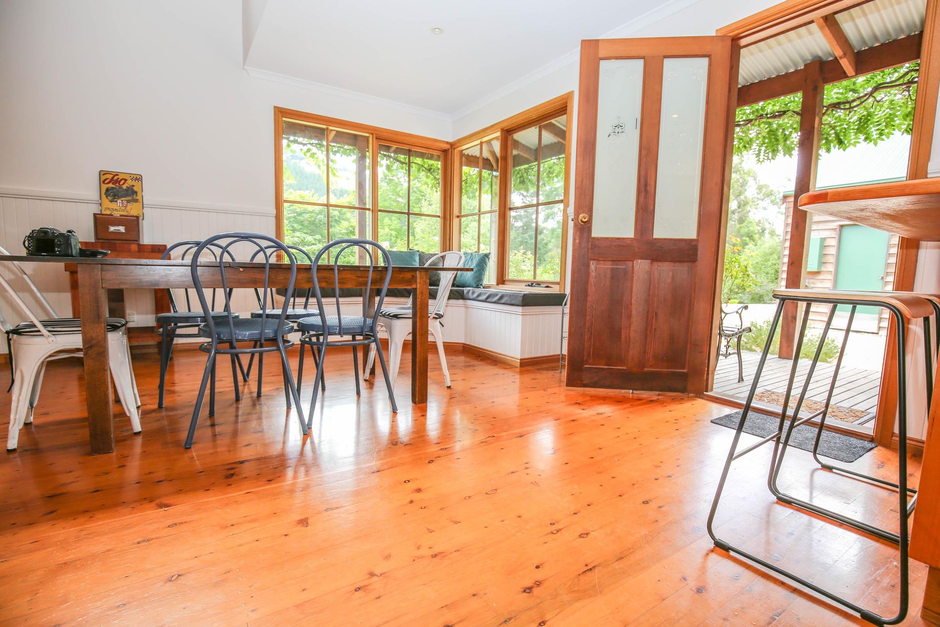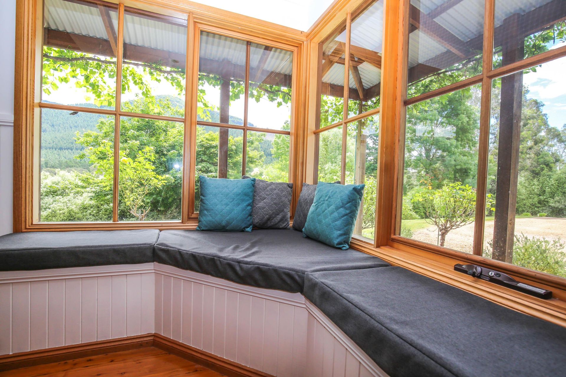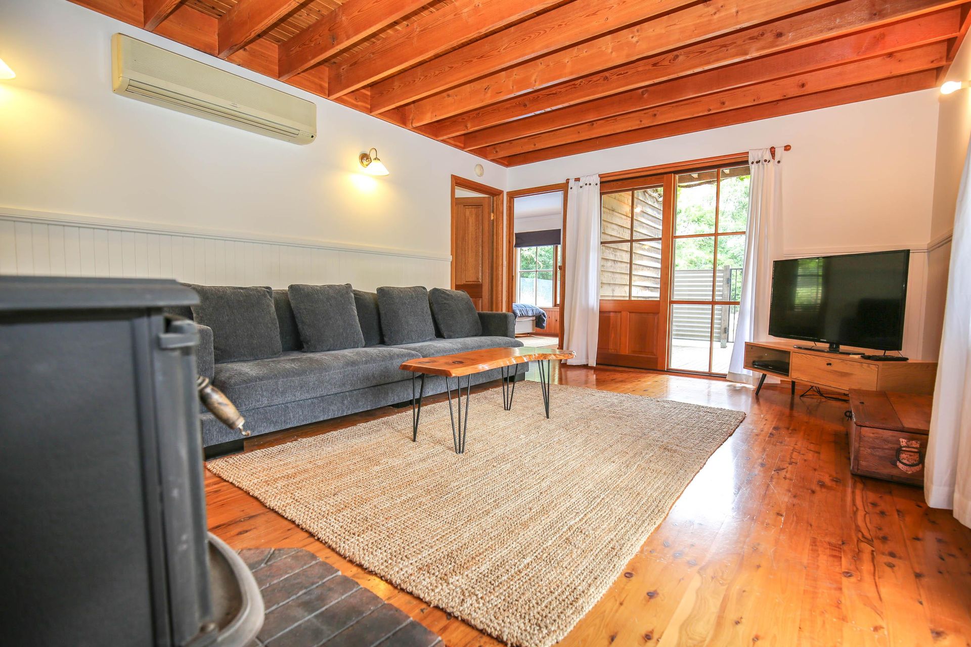 3 comfortable bedrooms, 2 with queen beds and 1 with 2 singles, the master bedroom in the upstairs loft has its own bathroom and French doors opening out onto a small balcony that looks straight out over the garden, pool and across the valley. The main downstairs bathroom features a shower over a quaint claw foot bath making this property ideal for 2 couples or a small family.